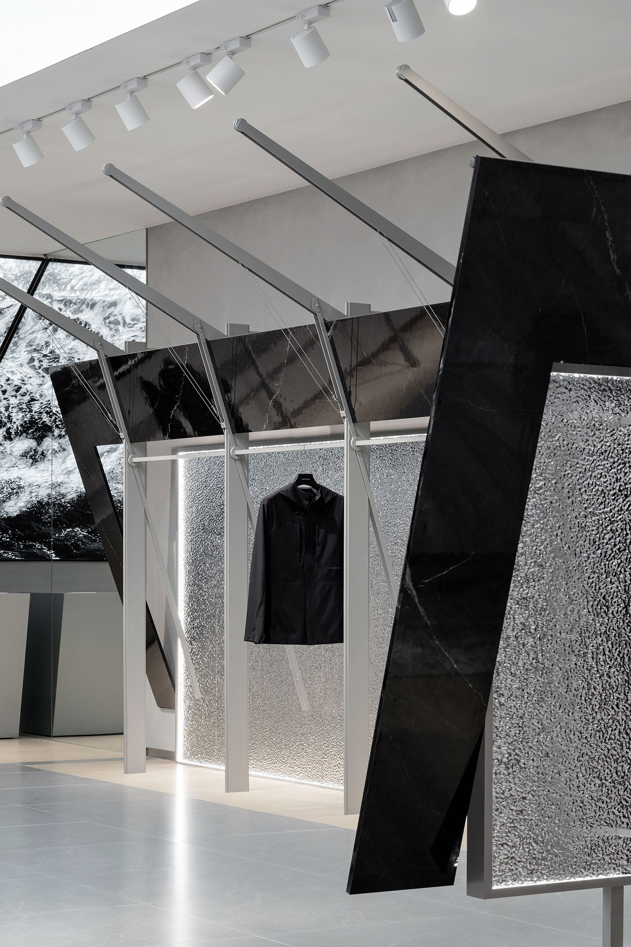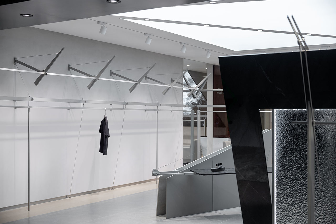 SLT 对这些元素的空间转译不仅解决了结构稳固性与商品悬挂的功能需求,其绷紧的线条更在空间中注入了强烈的视觉张力。这一具有“张力美学”的节点,同时极大地减少了现场焊接作业,以及繁琐的定制环节,对于品牌门店来说具有弹性适配的优势。