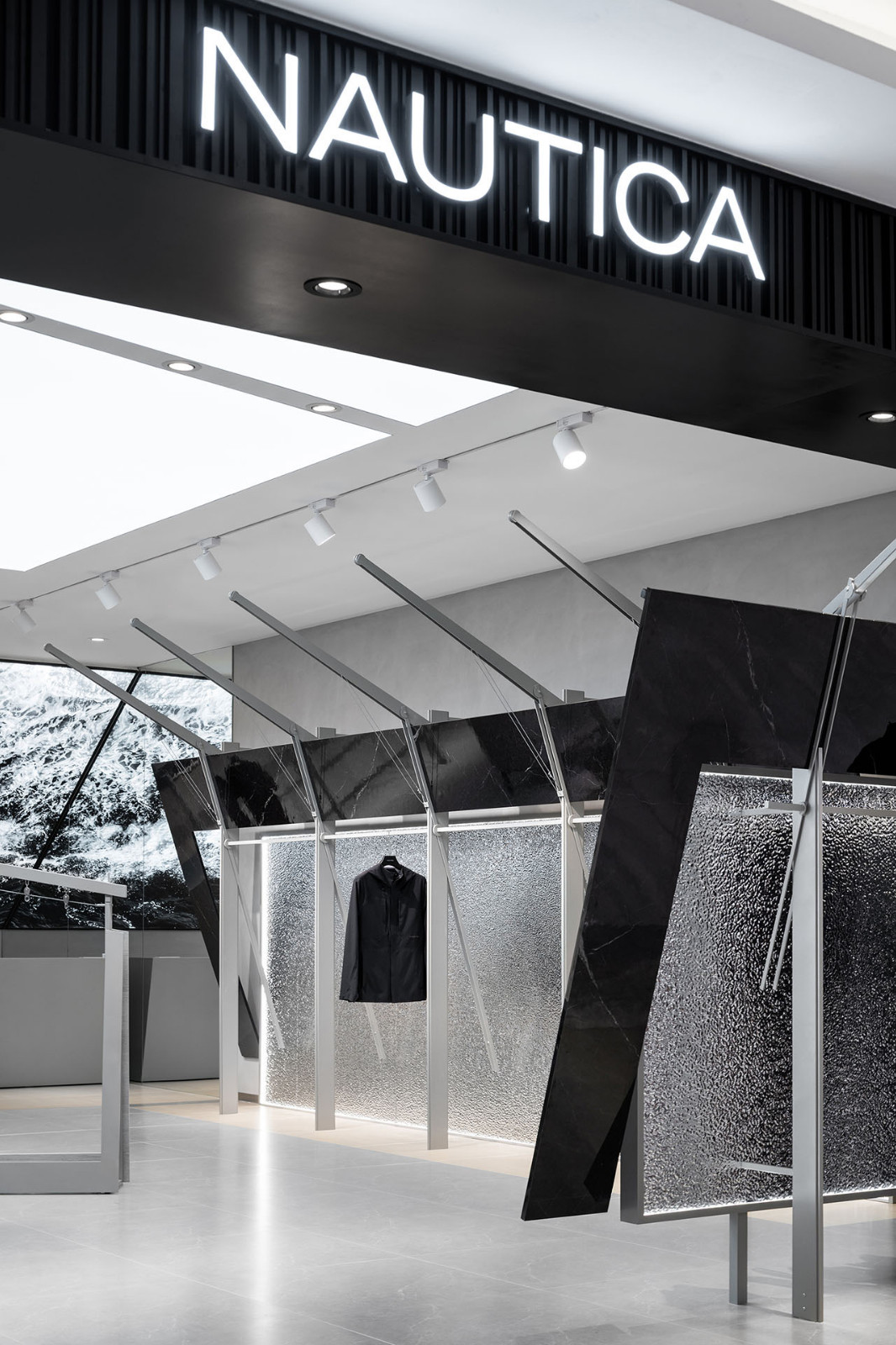 SLT 再次携手美国服装品牌 NAUTICA,为其黑标 BLACK LABEL 新系列打造空间形象,首店坐落于长春欧亚商都。设计超越航海符号的表层运用,通过一套严谨的模块化系统,将“帆船”的基因转译为当代、可复制的空间语言,塑造自由、冒险与自然感并存的零售场景。