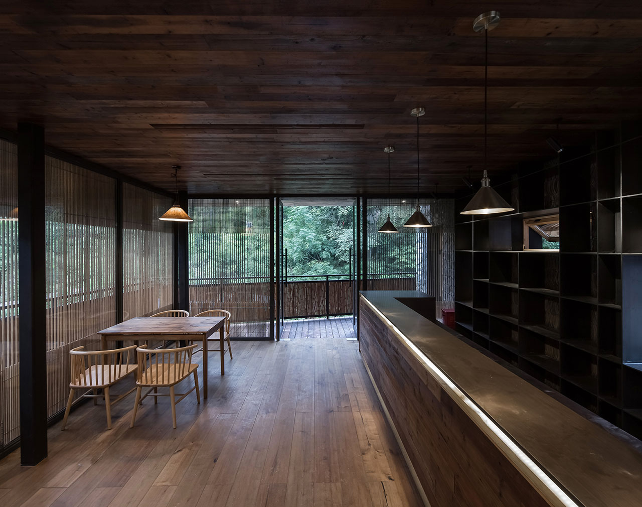 水吧作为民宿里面的公共空间,可以对外开放,是一个比较扁平的空间,外立面用竹格栅疏密布置,分上中下三段,水吧三个界面的视线明暗形成横向连续的画面关系,类似一张古画卷轴,古树在横向的卷轴中变成了画的一部分,卷轴连续的展现了村落巷道、连廊、水院、梯田、古树这些场景,希望用这种视角将人工和自然关连起来。水吧上面的屋顶平台集合了听水看溪、望山、观屋、赏树的所有视角,上楼梯步入平台,视线豁然开朗,建筑与村落环境的关系一下子被放开。