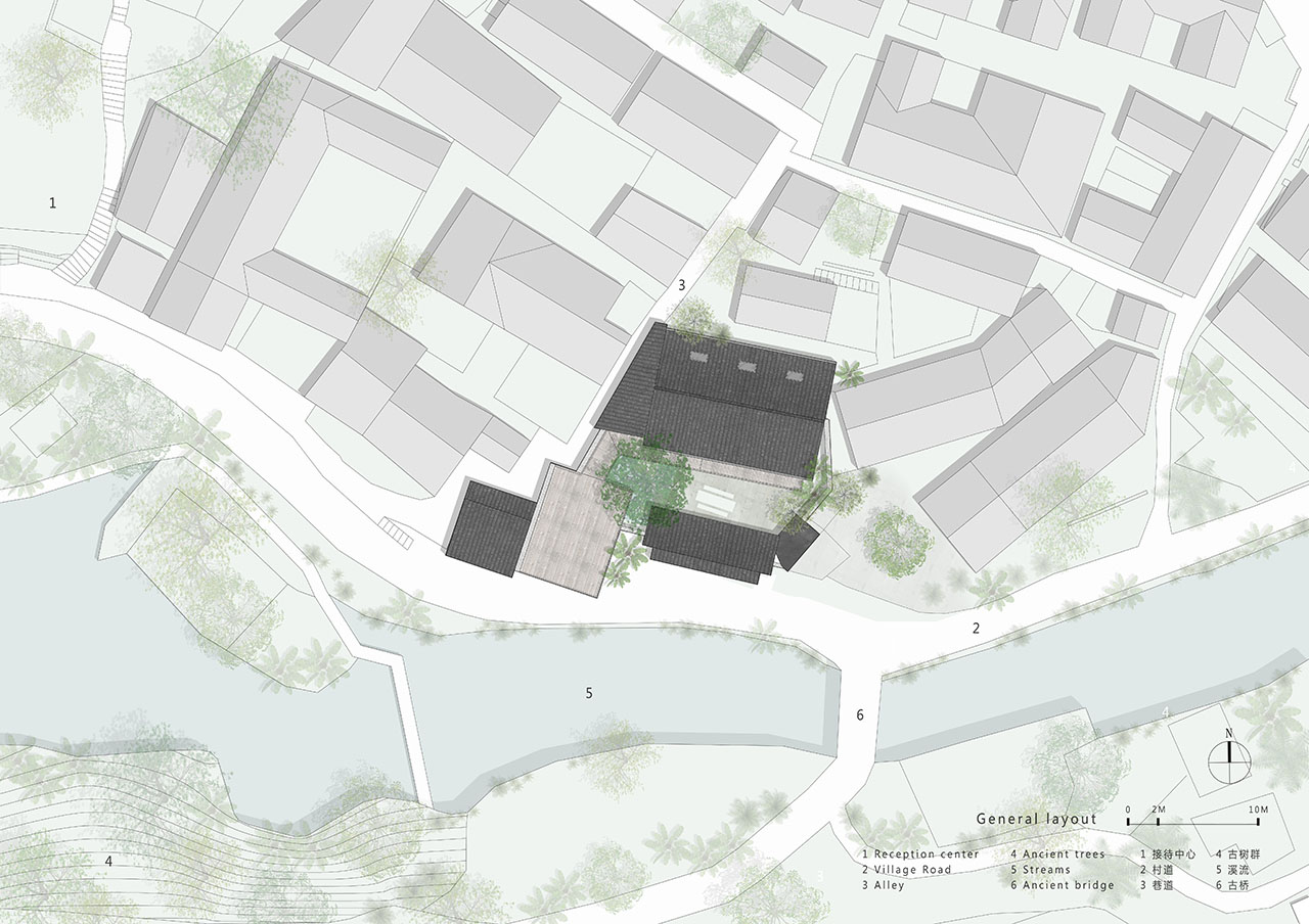 在村落中行走,随着地形的高低变化,民居的体量大小变化,方向的偏转,屋顶的边界关系呈现出来一种错落有致,变化无穷的状态。这种状态希望在设计中呈现出来,以呼应当地建筑屋顶形态的变化关系,所以建筑的体量被打散分解重构,屋顶方向斜度变化,形成与原有村落民居和谐的屋檐关系和体量关系。