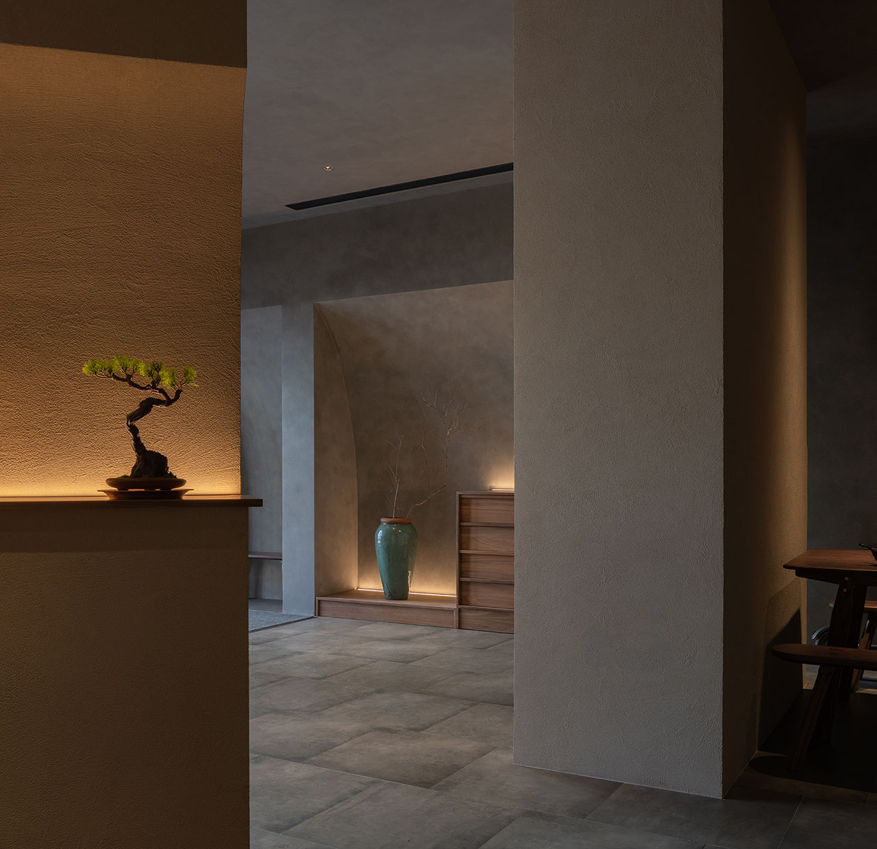 我们和灯光师合作,将室内灯具数量减到最少,仅在桌面上方布置有限的聚焦光源,辅以壁龛灯带投射出的洗墙光晕。林立的墙丛使整体空间不可一眼尽收,墙缝中露出的不知来源的微光引人流连探索。