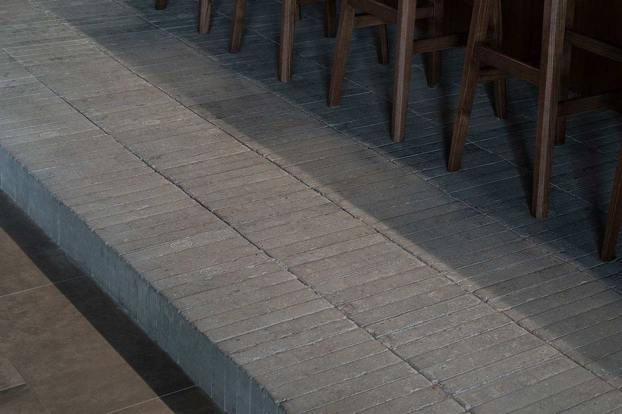 厨房和吧台区对空间完整度要求最高,因此被布置在基地北侧最长的两跨内。吧台区地面由青砖竖砌抬高,面向堂食区的南侧因剪力墙的遮挡而形成类似镜框式舞台的开口,使得吧台前后的食客与店员共同成为餐厅流线终点处的视觉焦点。