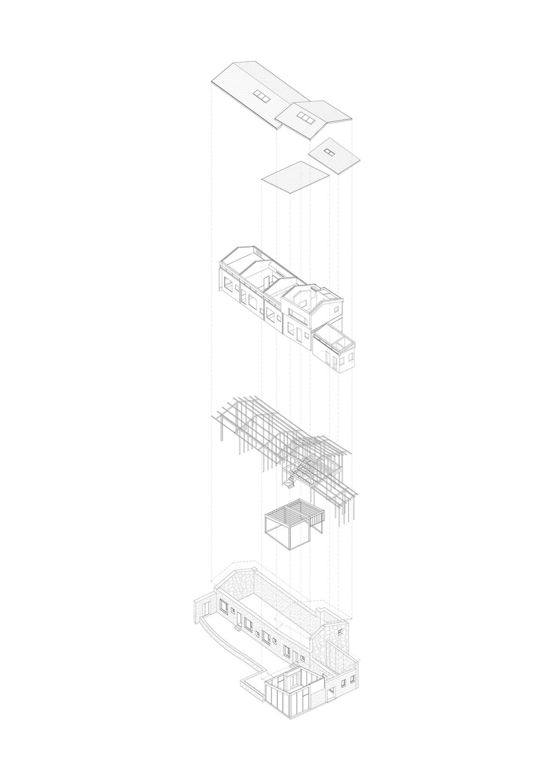 在石墙内部,采取了钢结构体系置入的手段,并将屋顶抬升80cm,让屋顶漂浮在石墙上方。同时,在石墙上部设置了侧天窗,让更多的光线和山林景观进入室内。石墙内部采用钢结构体系,这是一种工业化的手段。一方面,可以应对场地运输的限制和乡村施工工艺的精度问题;另一方面,钢结构体系和石墙体系有机融合,满足了民宿项目的多样化功能需求。同时,使新和旧、轻和重有了强烈的对比,在村落中形成了戏剧化的效果。