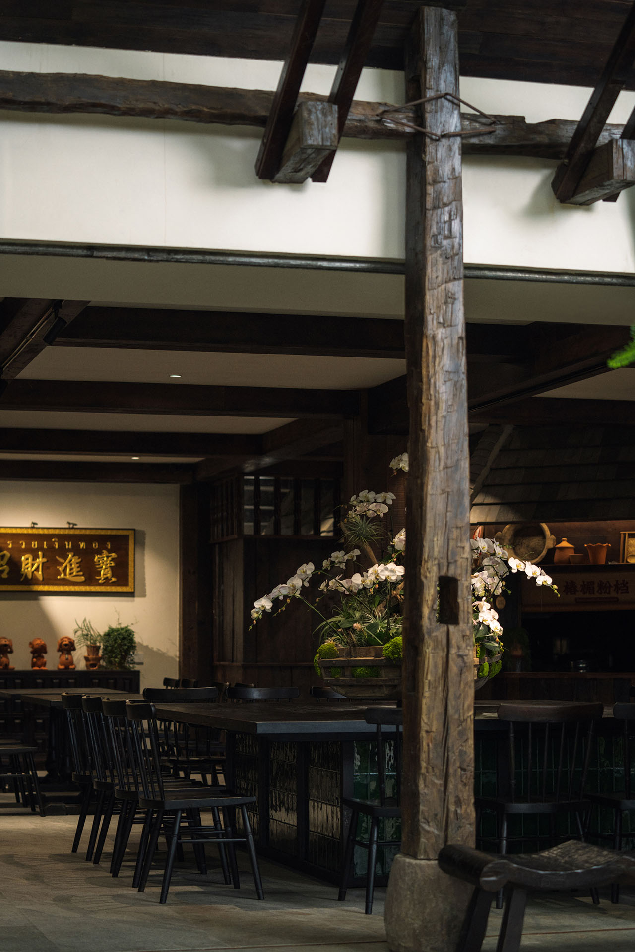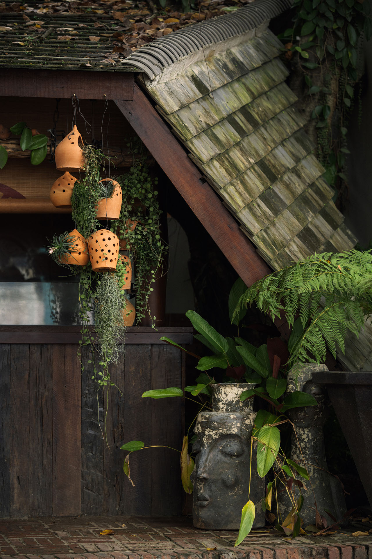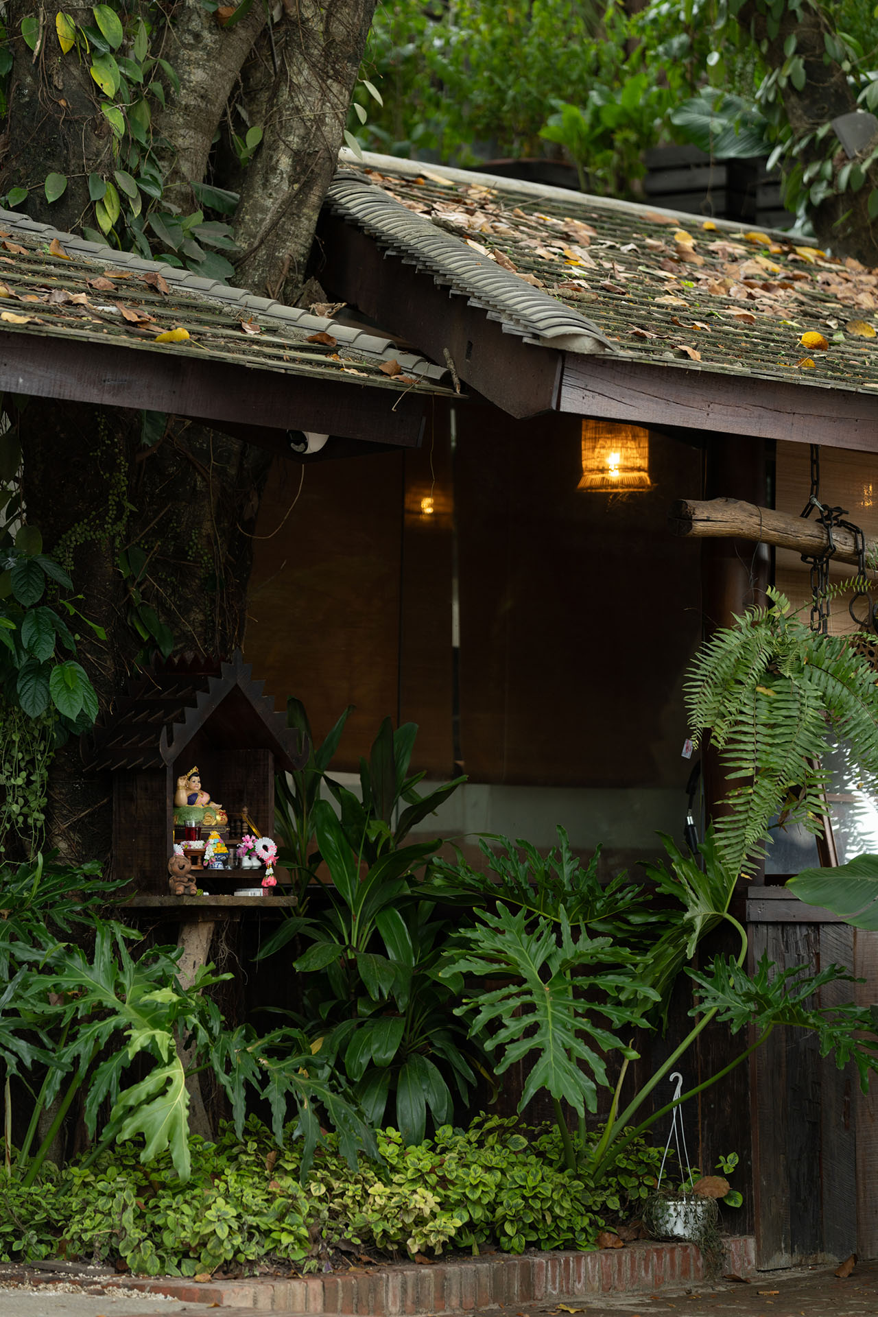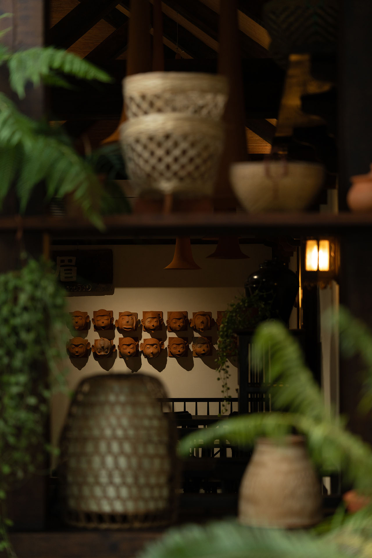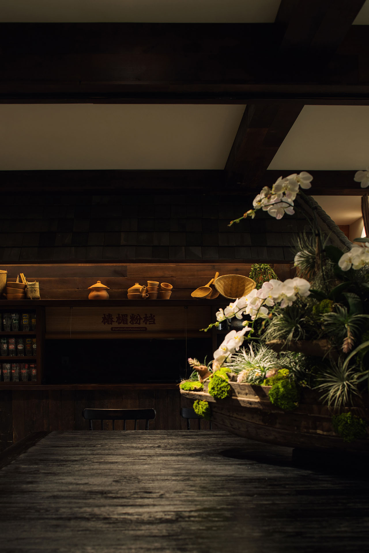 在椿楣粉档,光线并未被当作需要精确控制的视觉工具,而更像是一种自然进入空间的条件。瓦片将自然光切割为柔和而分散的亮度,落在植物、木梁与陶罐表面,使空间始终保持缓慢而潮润的时间感。