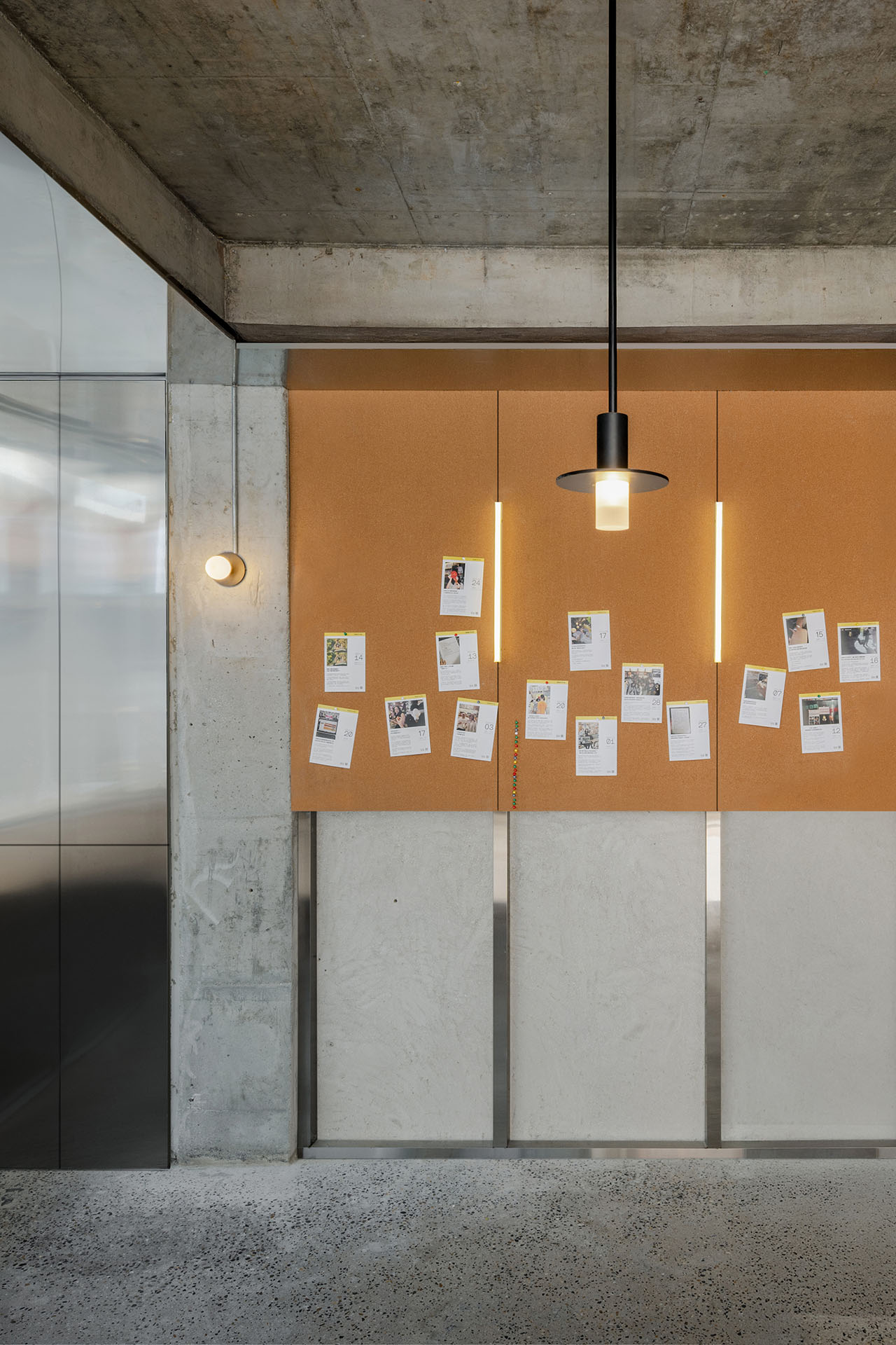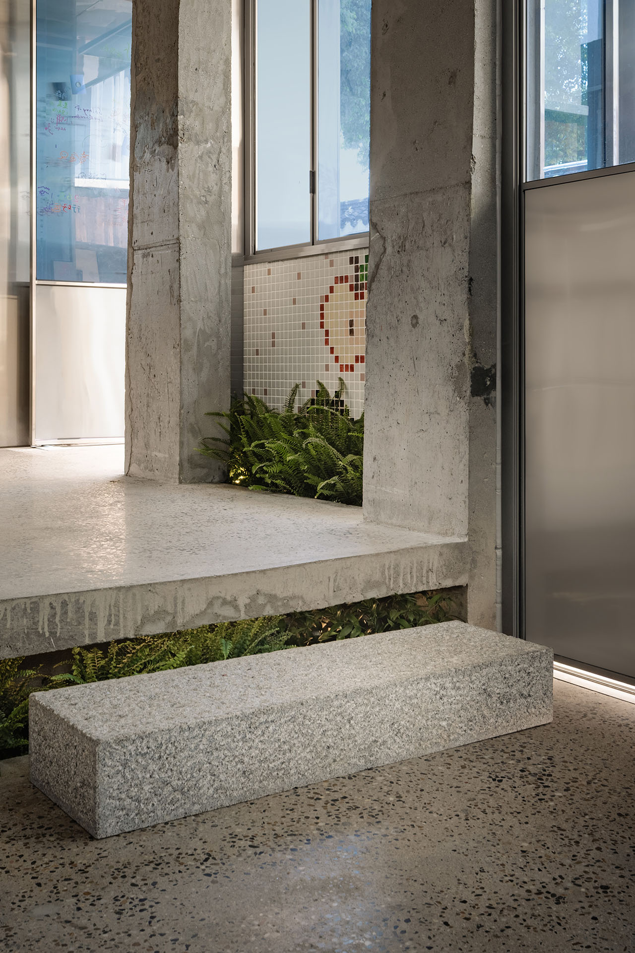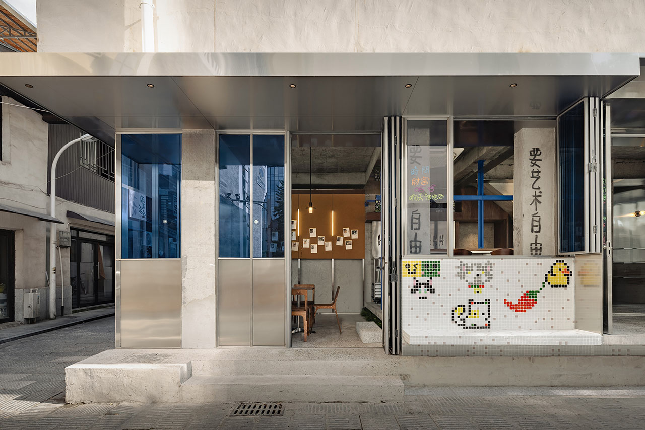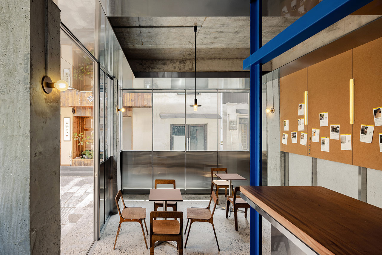 为了尊重城市的既有工业化脉络,空间有意使用大量不锈钢材。不同碳含量的钢材在室内分别承担吸附宣传物料看板与结构装饰件的功能。R-BAS对老式钢窗节点进行反复研究和转译,发明了一套同隔墙、天花、固定家具合为一体的三重门窗套—框—扇肋系统,使旧日建筑以当代手法轻盈地呈现。