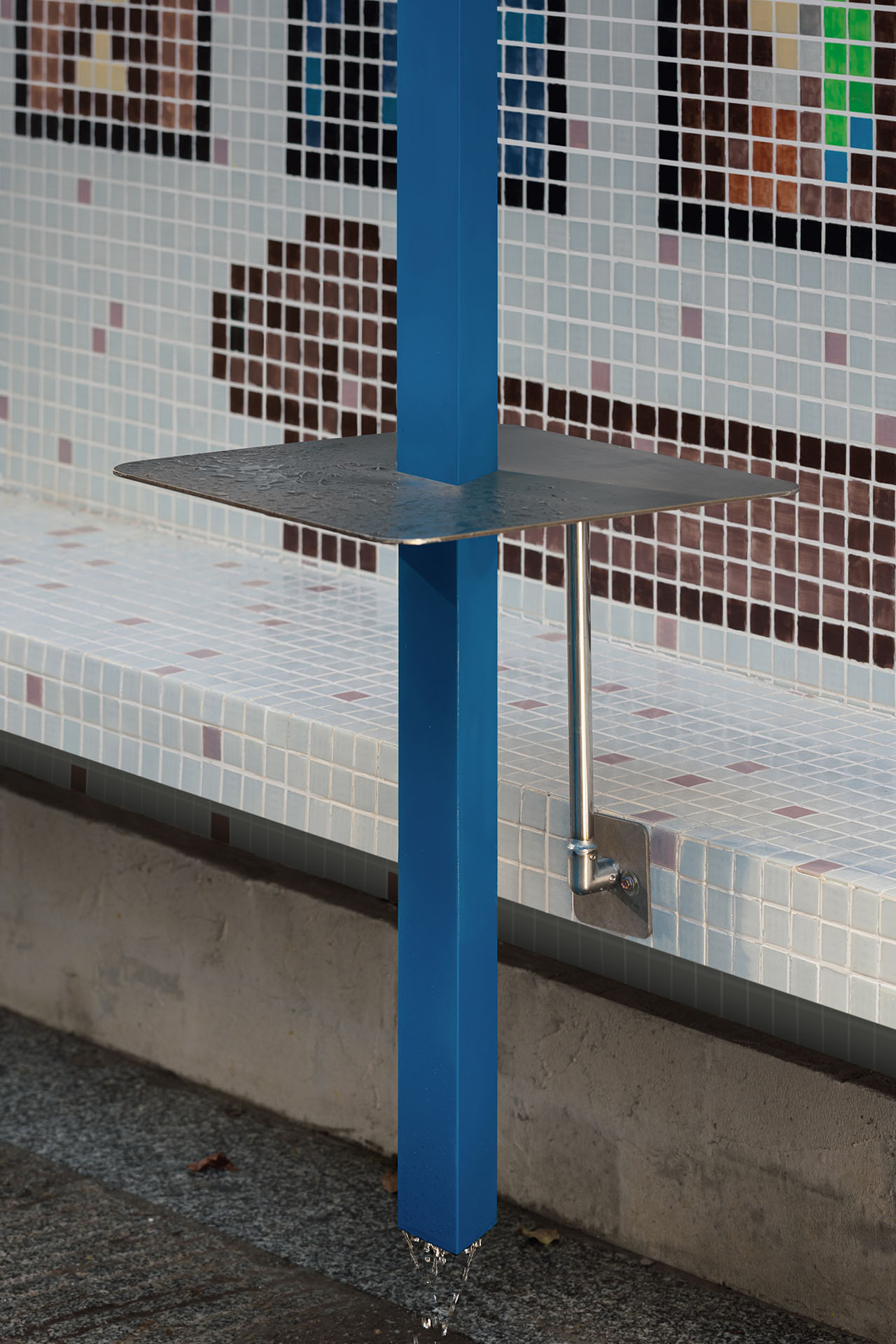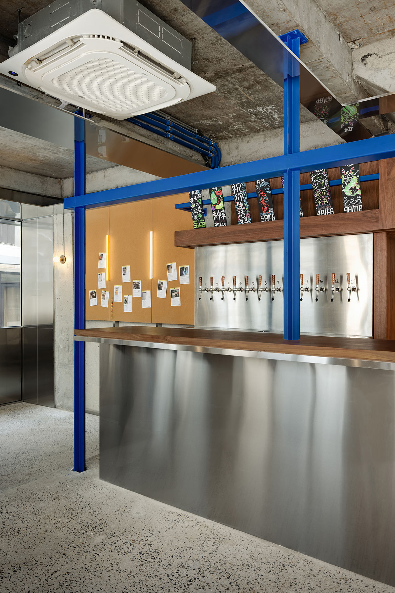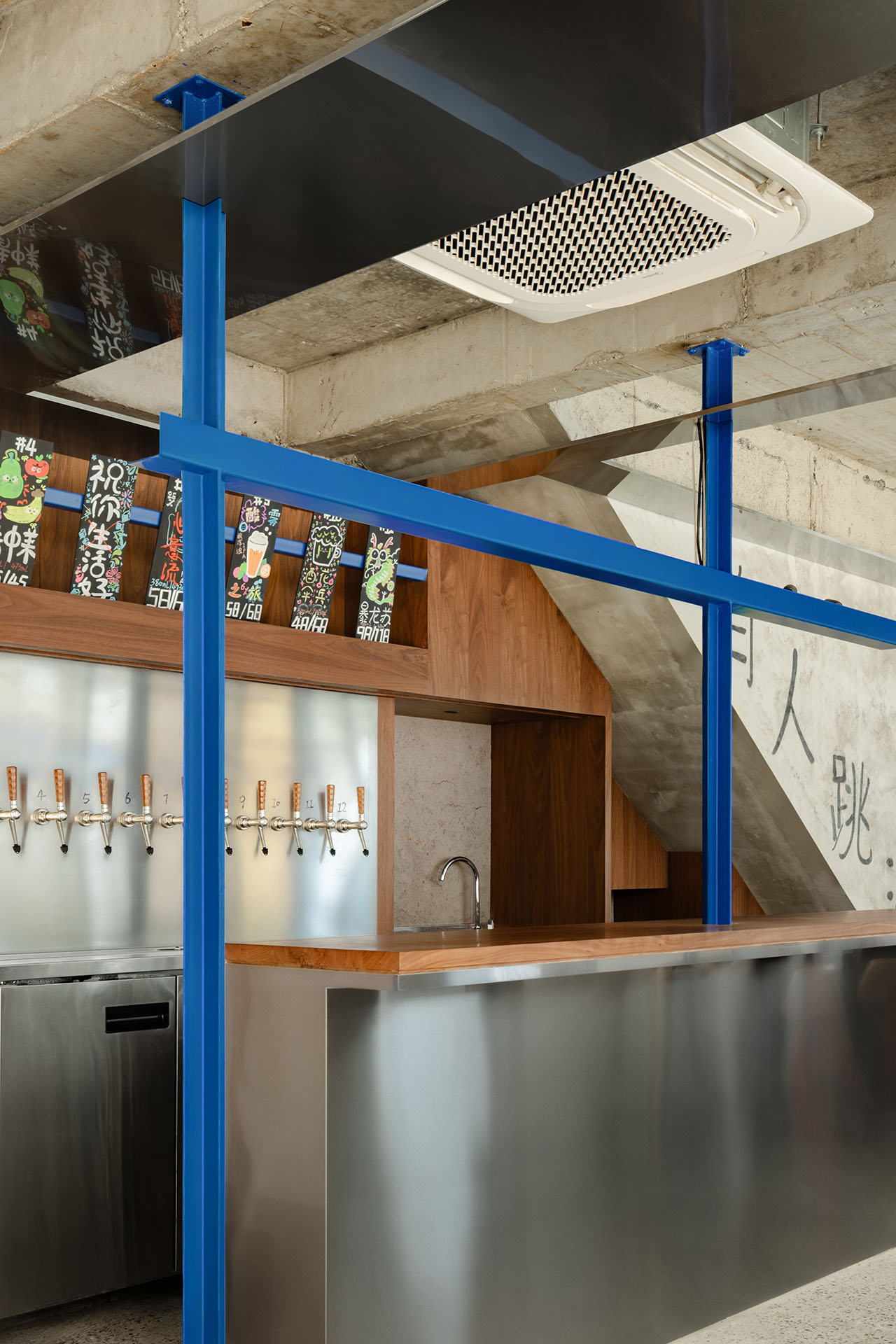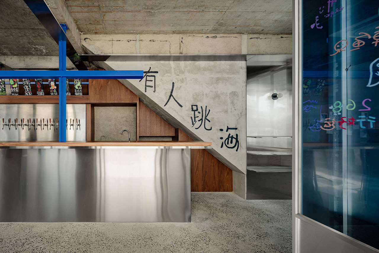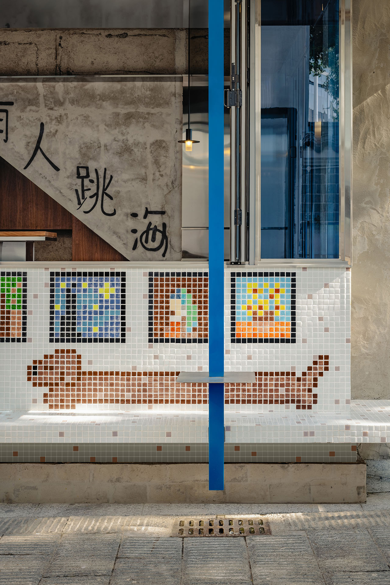 局部裸露的旧结构与由角钢制作的色彩跳跃的蓝色十字柱梁共同强调了历史和当下的对话。十字柱梁亦为照明灯具提供支撑。出于商业文化原则,跳海酒馆杜甫江阁店被定义成一间「野生美术馆」。从而在该项目,设计师致力将「反思性怀旧」理念贯彻始终。场地主要材料选择了80年代流行的纸皮马赛克砖、随磨随浇水混凝土及钴蓝玻璃。这是深思熟虑的结果,令酒馆得以完美融入朴素日常的社区环境,而非开天辟地式地创造一个社交媒体「打卡」点。