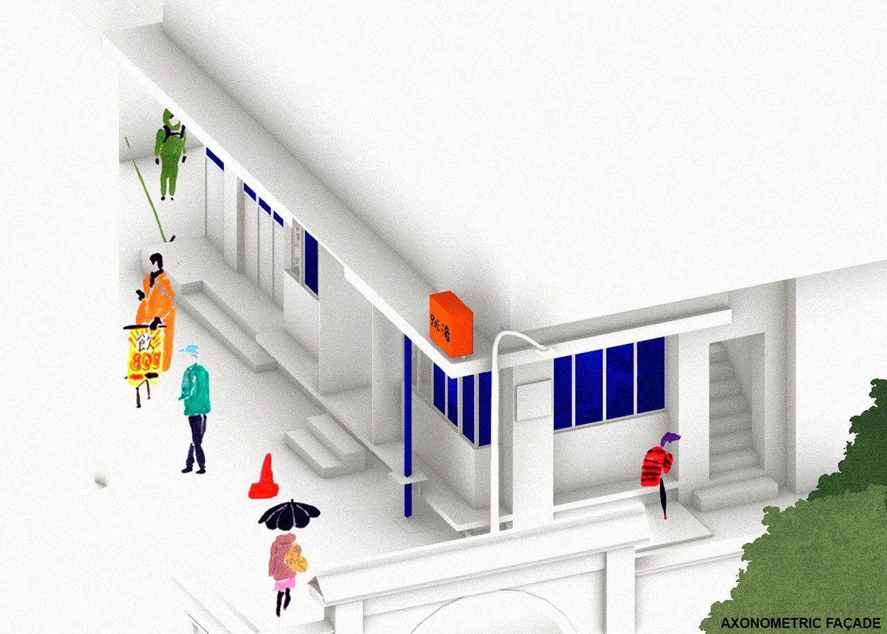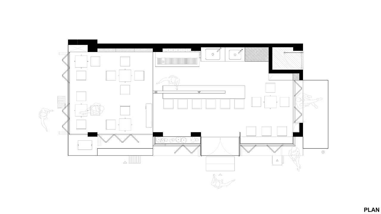 设计灵感源自20世纪在地现代主义建筑记忆——长沙火车站的水平立面、竖向幕墙杆件及网格平面组织型式。朝北的入口和大屋面则体现楚辞记载的民居范式。R-BAS将铺地抬高,组成多级高度不一、虚实相间的台阶、栽有南方蕨类植物的花池、座椅。室内外增设了漂浮桌板,让利用场景灵活化。三角落水管被引入,「水周兮堂下」,使立面与休憩家具有机结合。