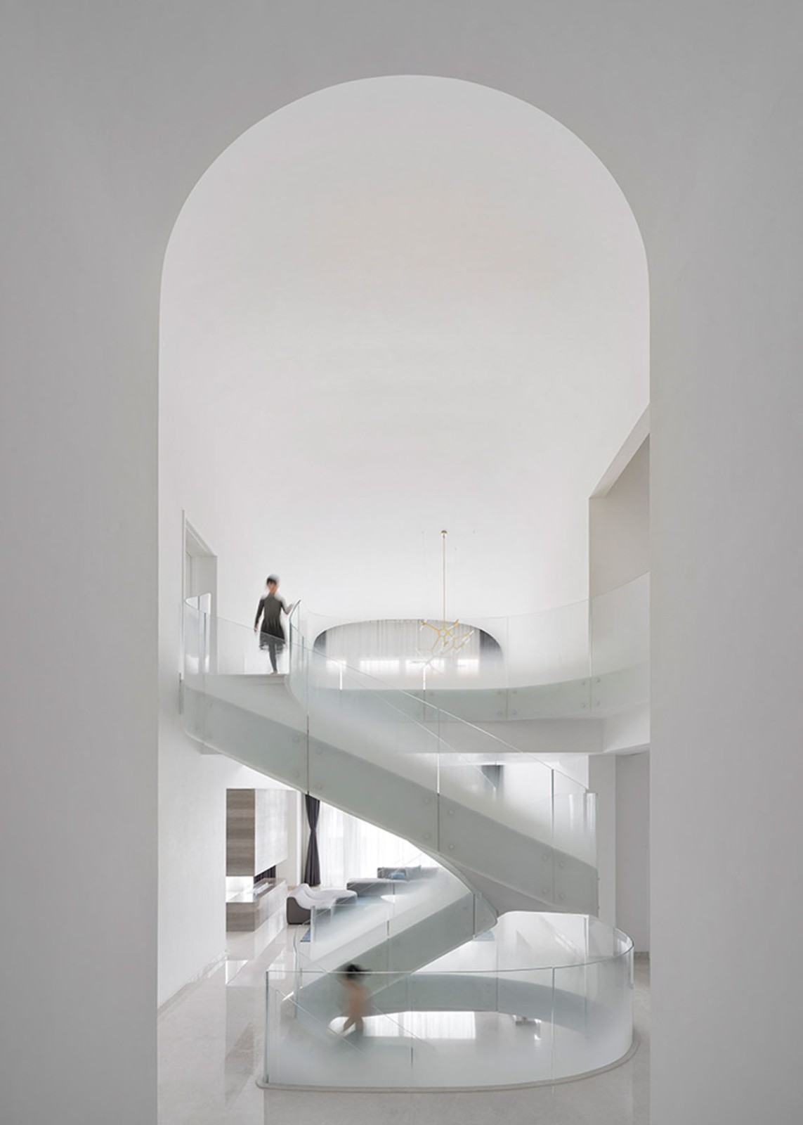 “云之斋”的名字对应了建筑中央的云梯:一个以金属结构为内部框架,并包裹钢化贴膜玻璃扶手,从地下室旋转而上的无支撑旋转楼梯。整体的室内设计风格围绕云梯展开,我们运用了大量的弧线设计,包括家具,硬装墙面,楼板轮廓等。