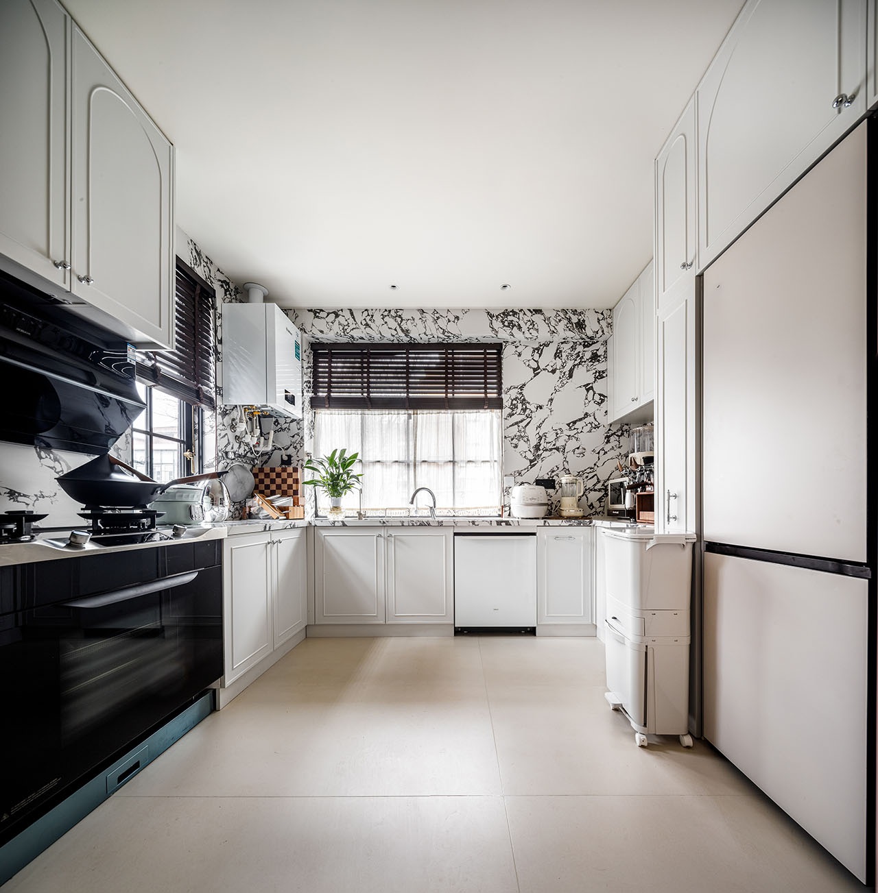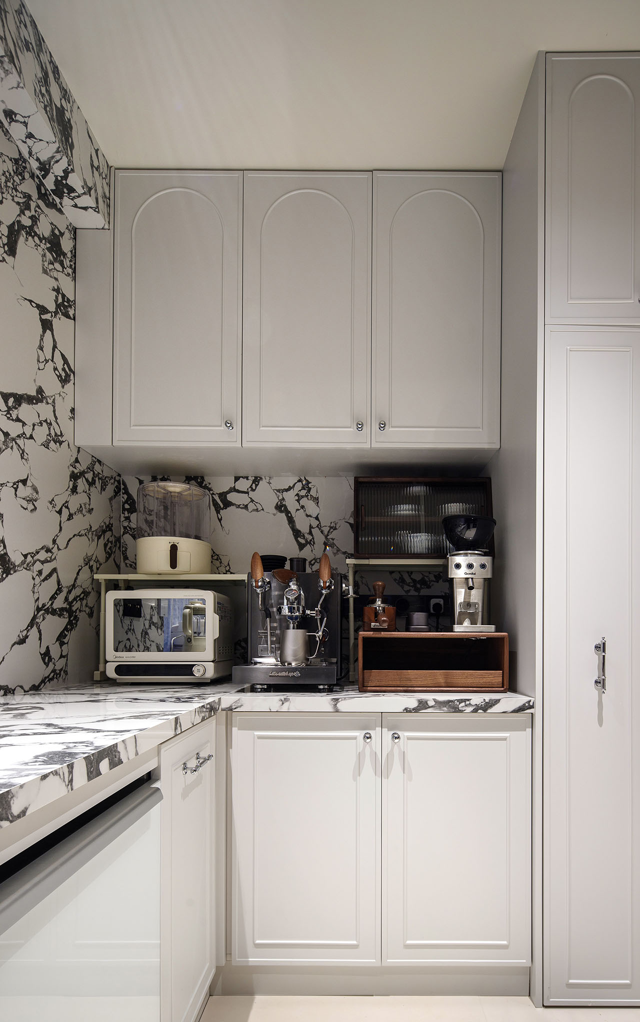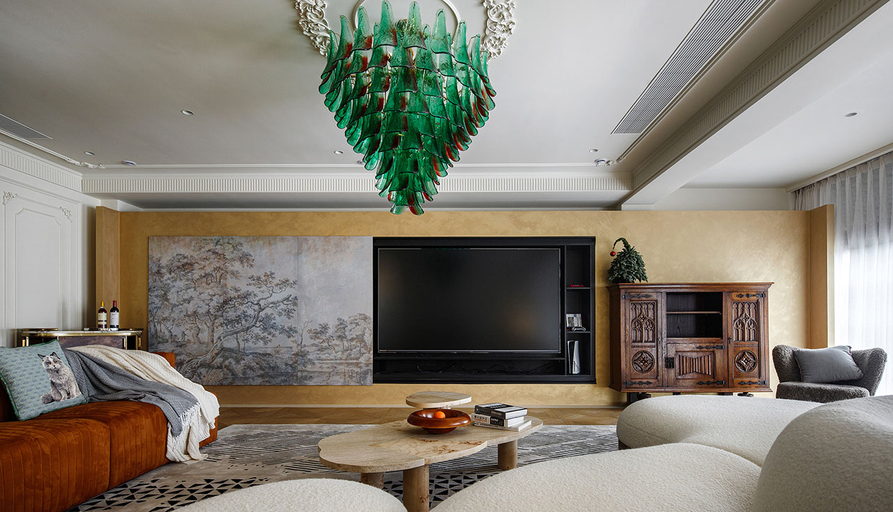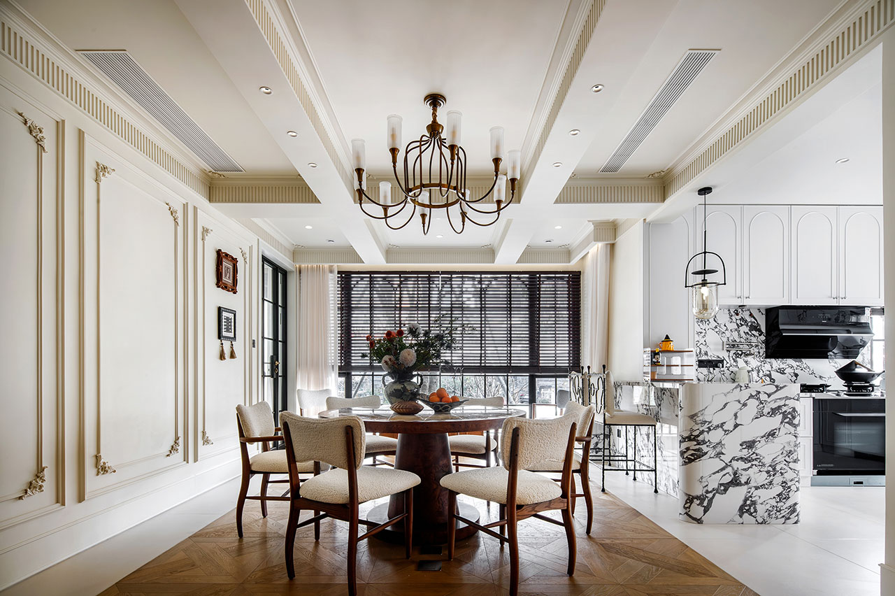 推开二楼玄关门,才算真正“回家”。半开放式餐厨为客厅注入烟火气息,客厅向外扩展连接茶室,沙发与壁炉围合出温馨场景。墙体被打破,功能不再被切割成独立的房间——从餐厅到客厅,一家人可以各自忙碌,却又彼此看得见、听得见。家的温度,正藏在这些“看得见”的时刻里。