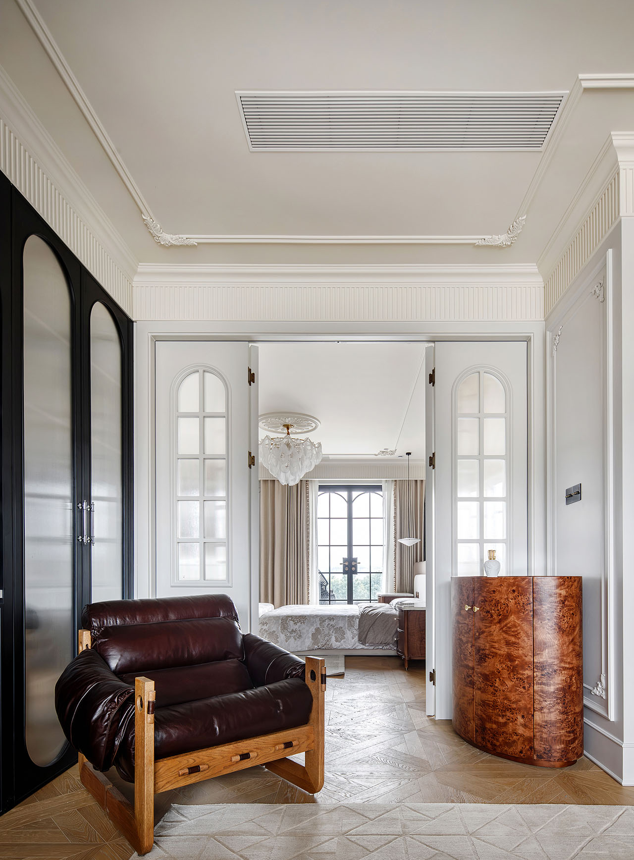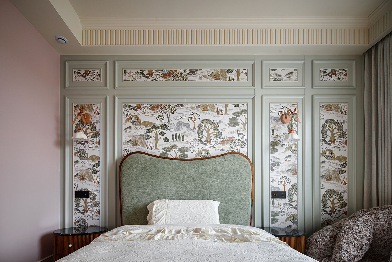 三楼是女孩们与母亲的独立世界。姐姐的粉色套间拥有衣帽间、浴室和梳妆台,童趣与浪漫并存;妹妹的儿童房按小尺度设计,小木屋、小滑梯满足幼龄探索,书桌置于露台边,让自然陪伴成长。边户的三面露台将姐妹与外婆的卧室串联——一边是孩子们的陪伴与秘密,另一边,外婆房中的老钢窗映着满室绿意,深色木质家具恰如其分地诉说着“格调”。