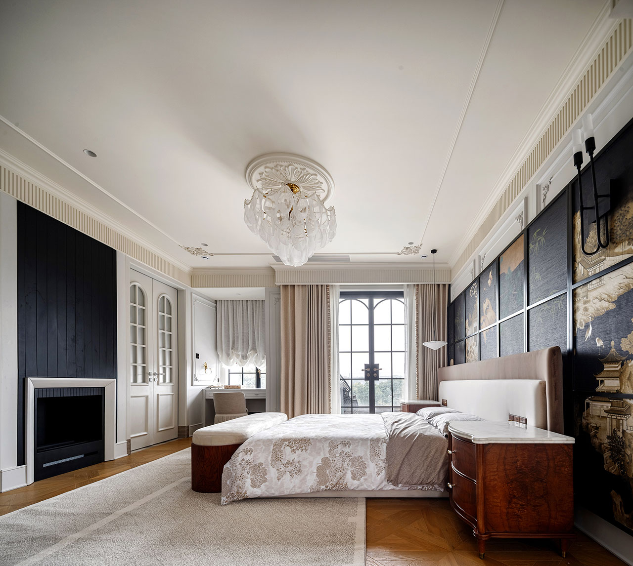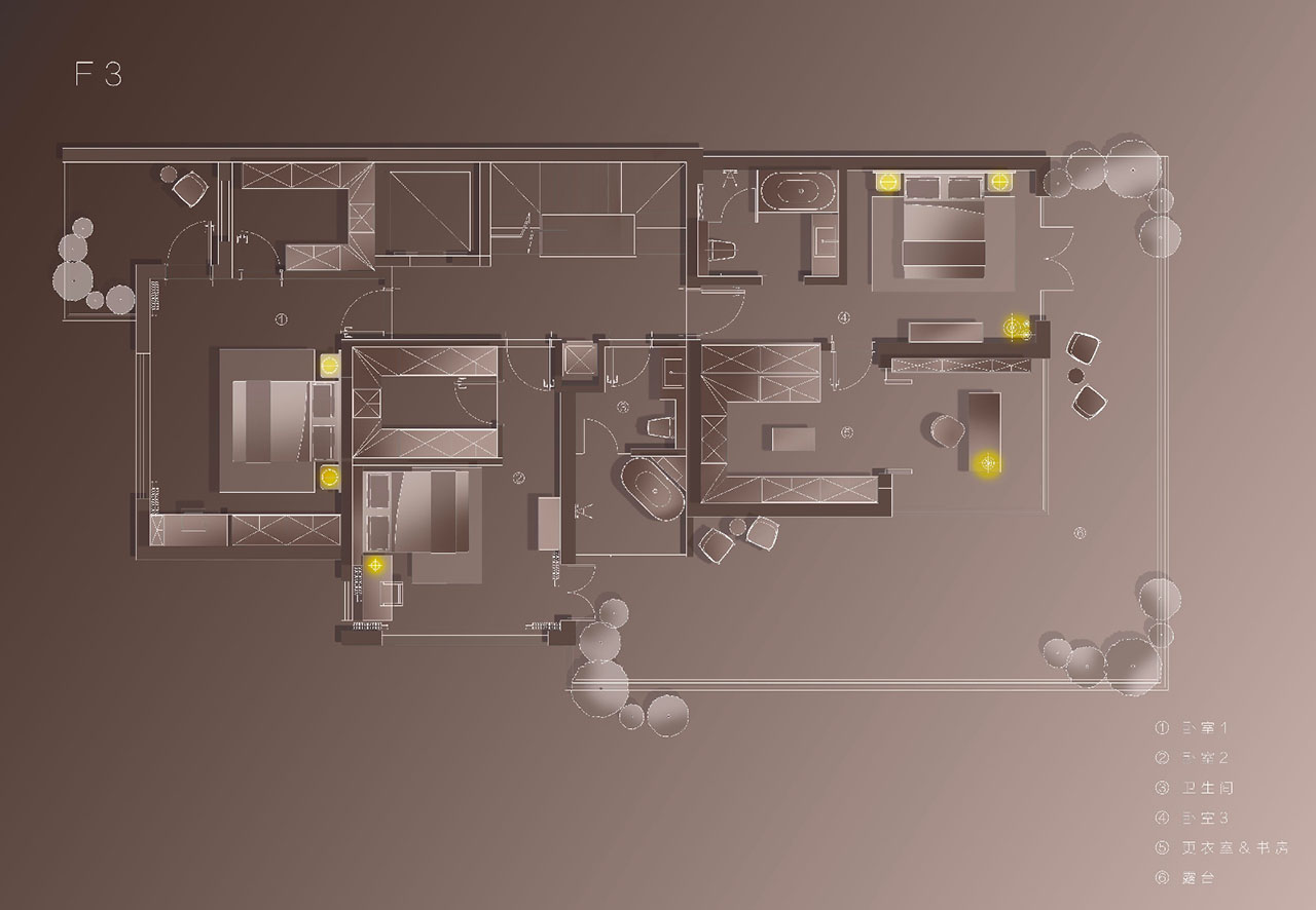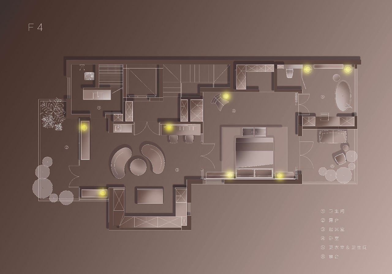 四层是业主的私人领地。最大尺度留给了主卧套房,前后两个露台采光最佳,分别成为男女主人放空的结界。两间卫浴各自配置浴缸与桑拿房,考虑不同偏好——他洗漱他的,她收拾她的,互不干扰。真正的好住,藏在这些“不争不抢”的日常里。