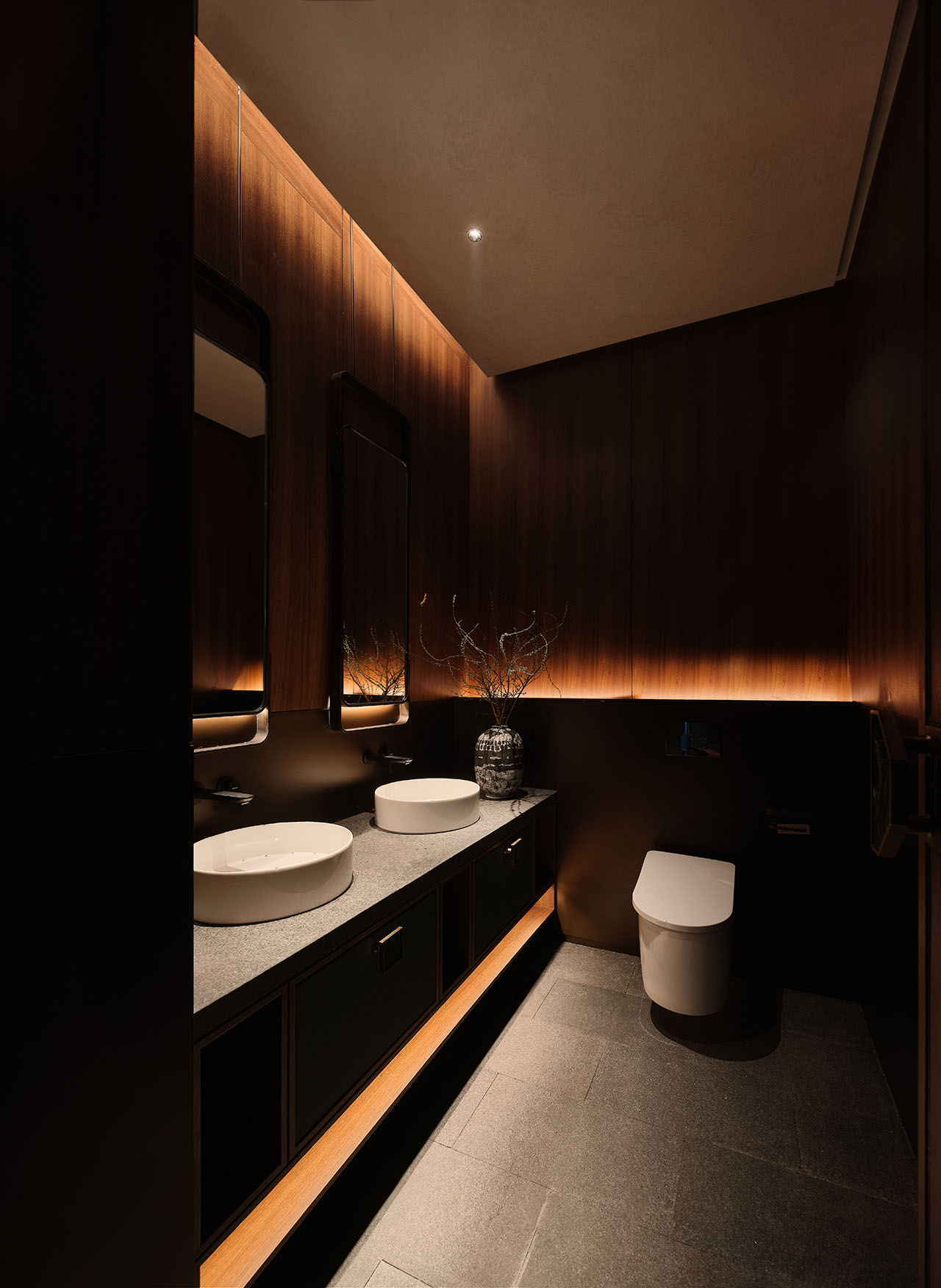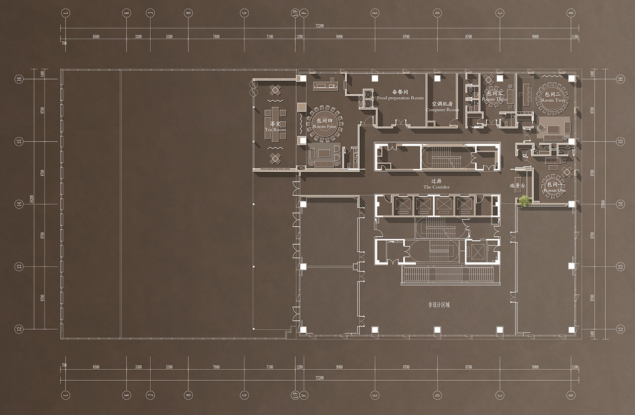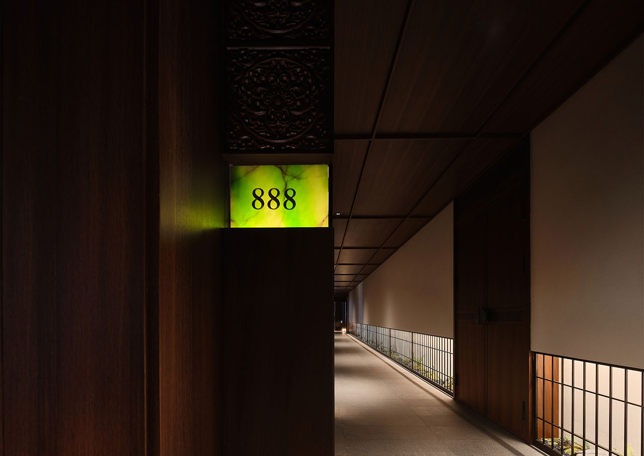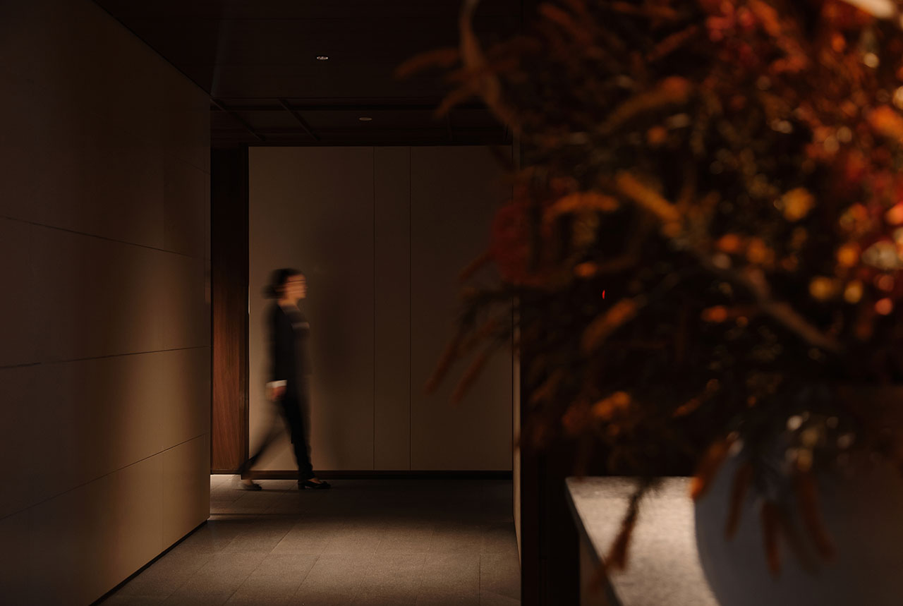 回廊部分,受层高的原因,我们希望弱化顶面结构的同时,采用低位光的形式,补充空间照明,以凸显空间之幽静