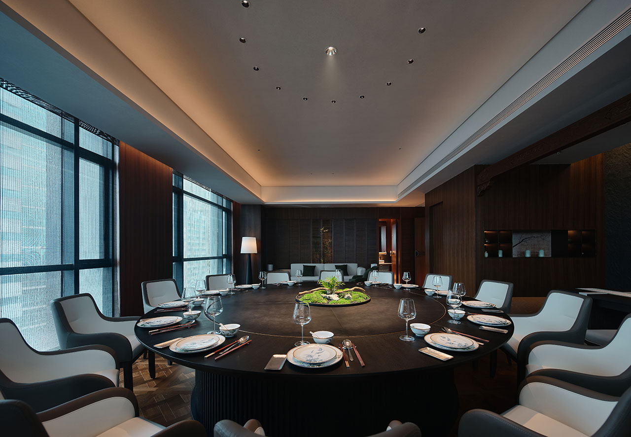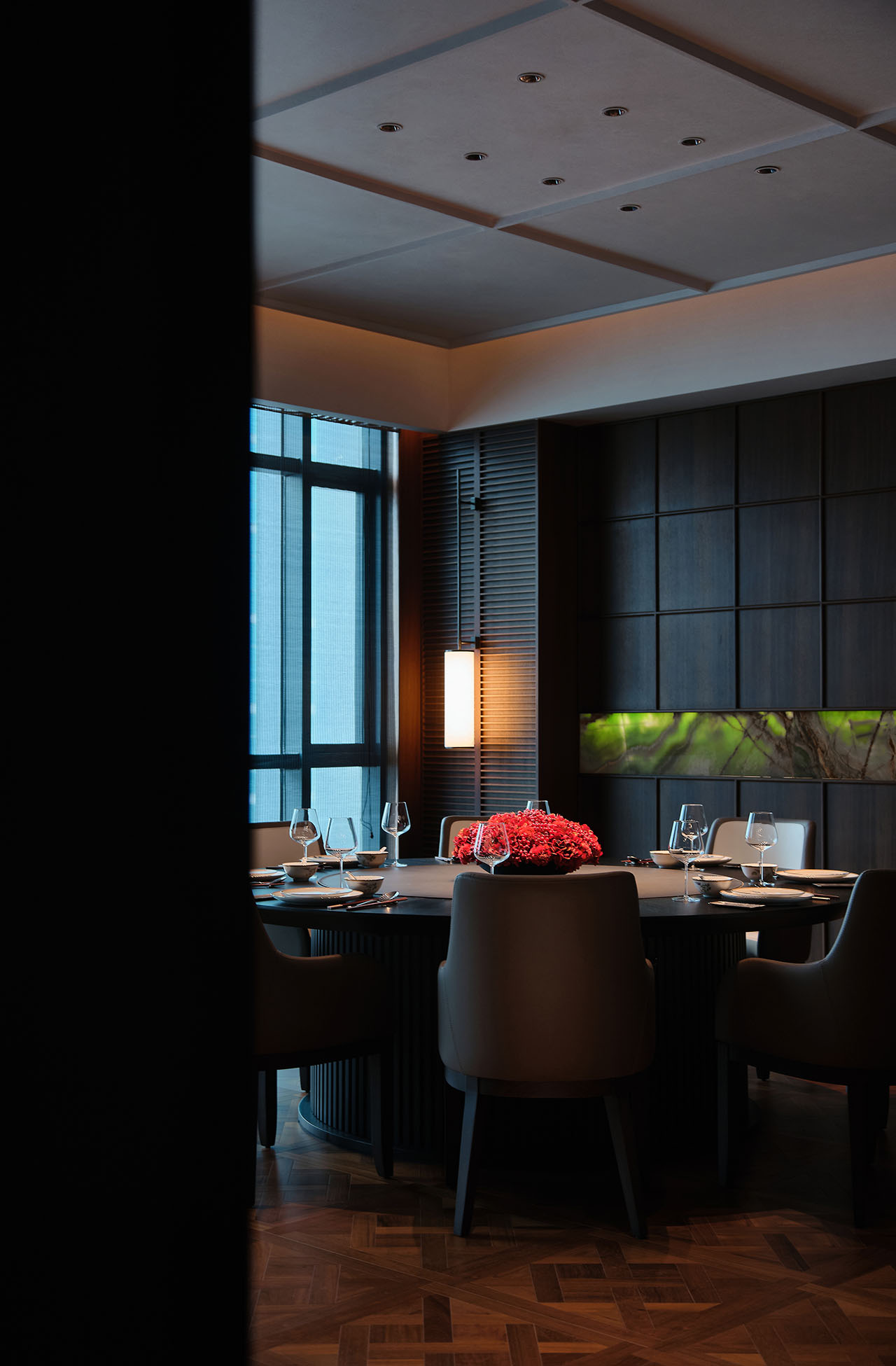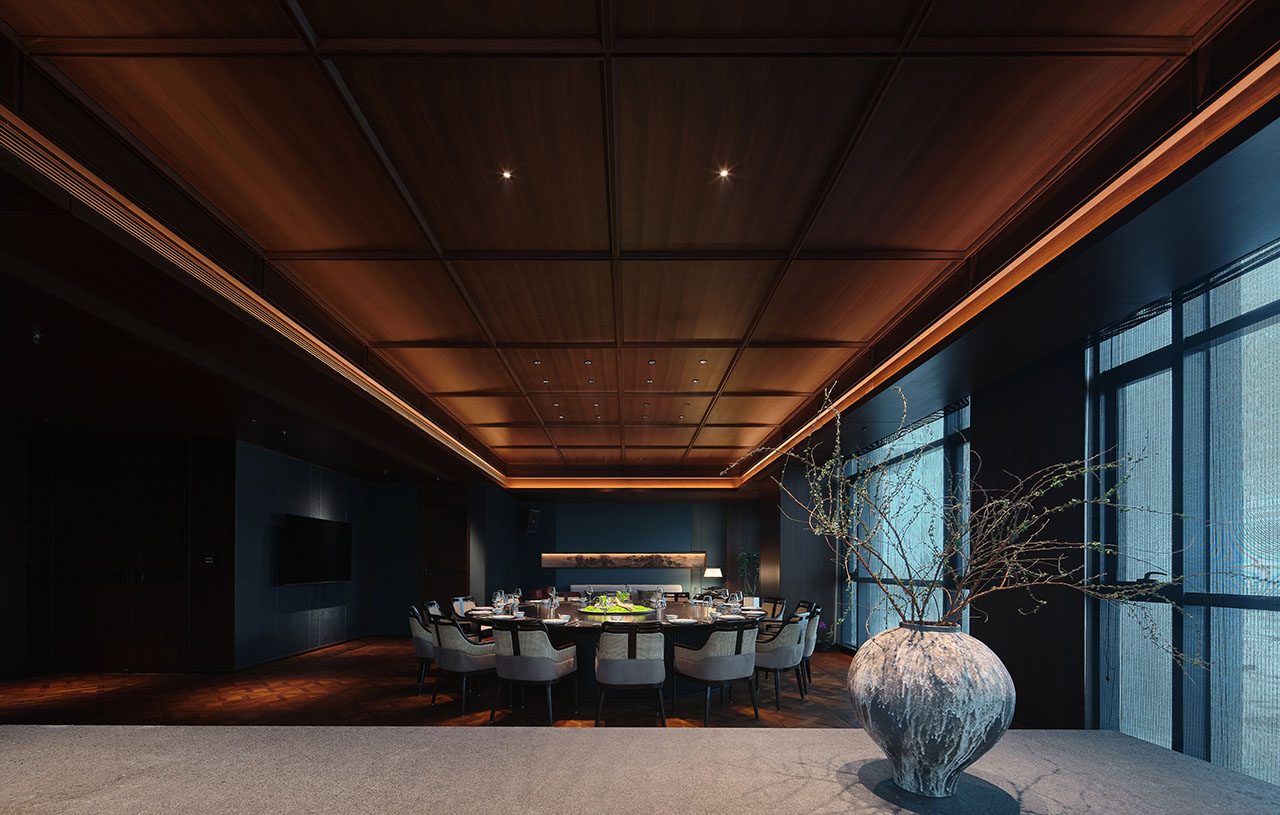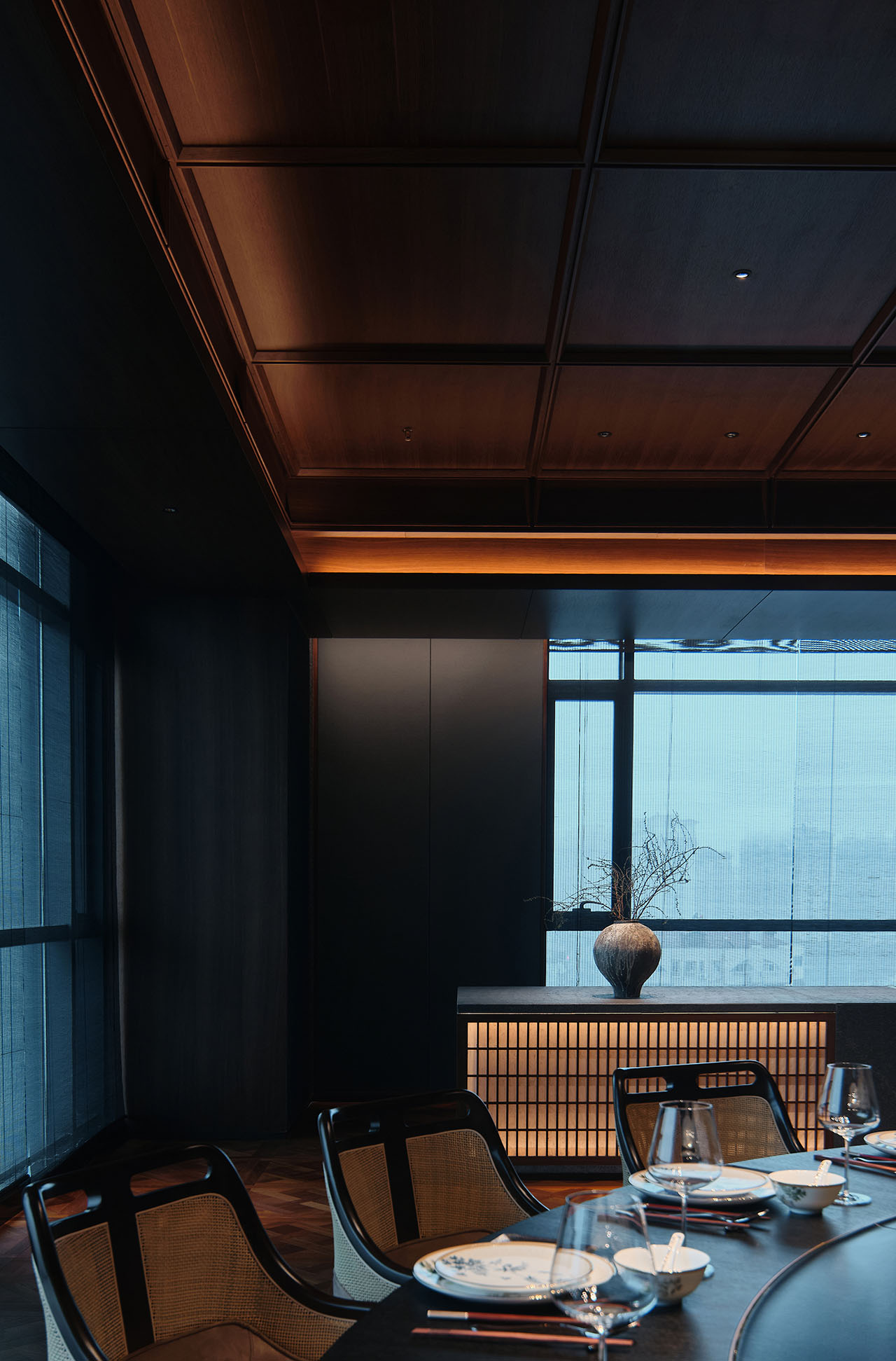 木质格栅造型的设计,让人仿佛置身于古老的南京园林中。石材点缀其中,构成静谧的自然景观。包间二整体空间以温润的木色为主,配以柔和的照明,营造出大隐于市的雅致氛围。