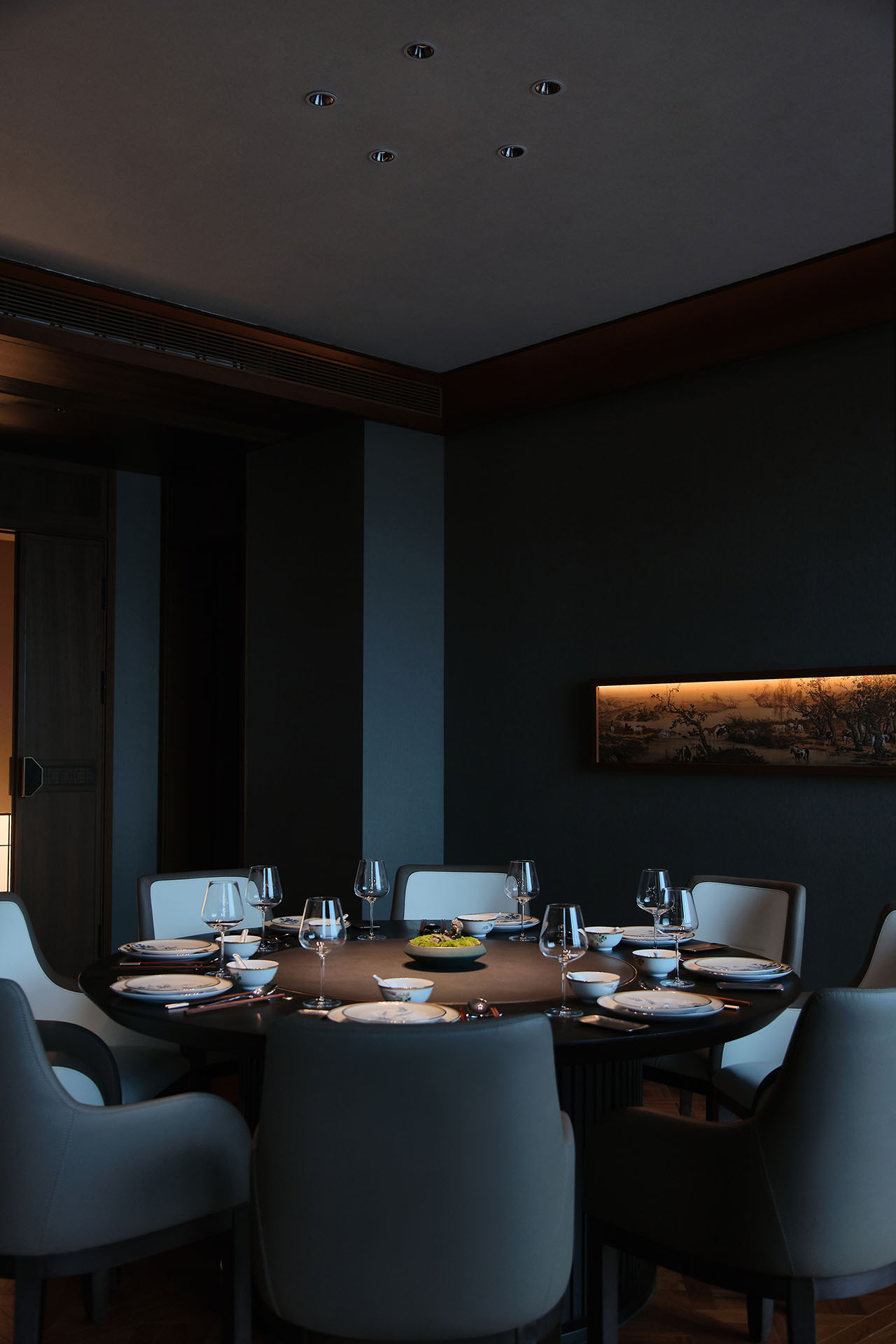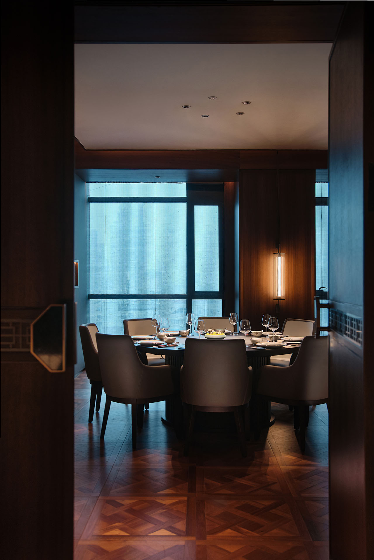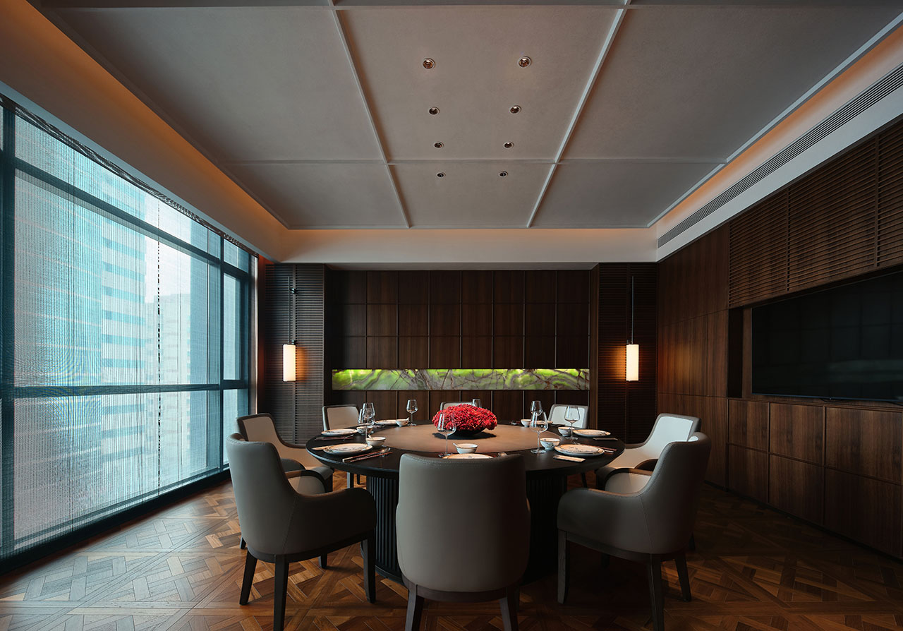木质格栅造型的设计,让人仿佛置身于古老的南京园林中。石材点缀其中,构成静谧的自然景观。包间二整体空间以温润的木色为主,配以柔和的照明,营造出大隐于市的雅致氛围。