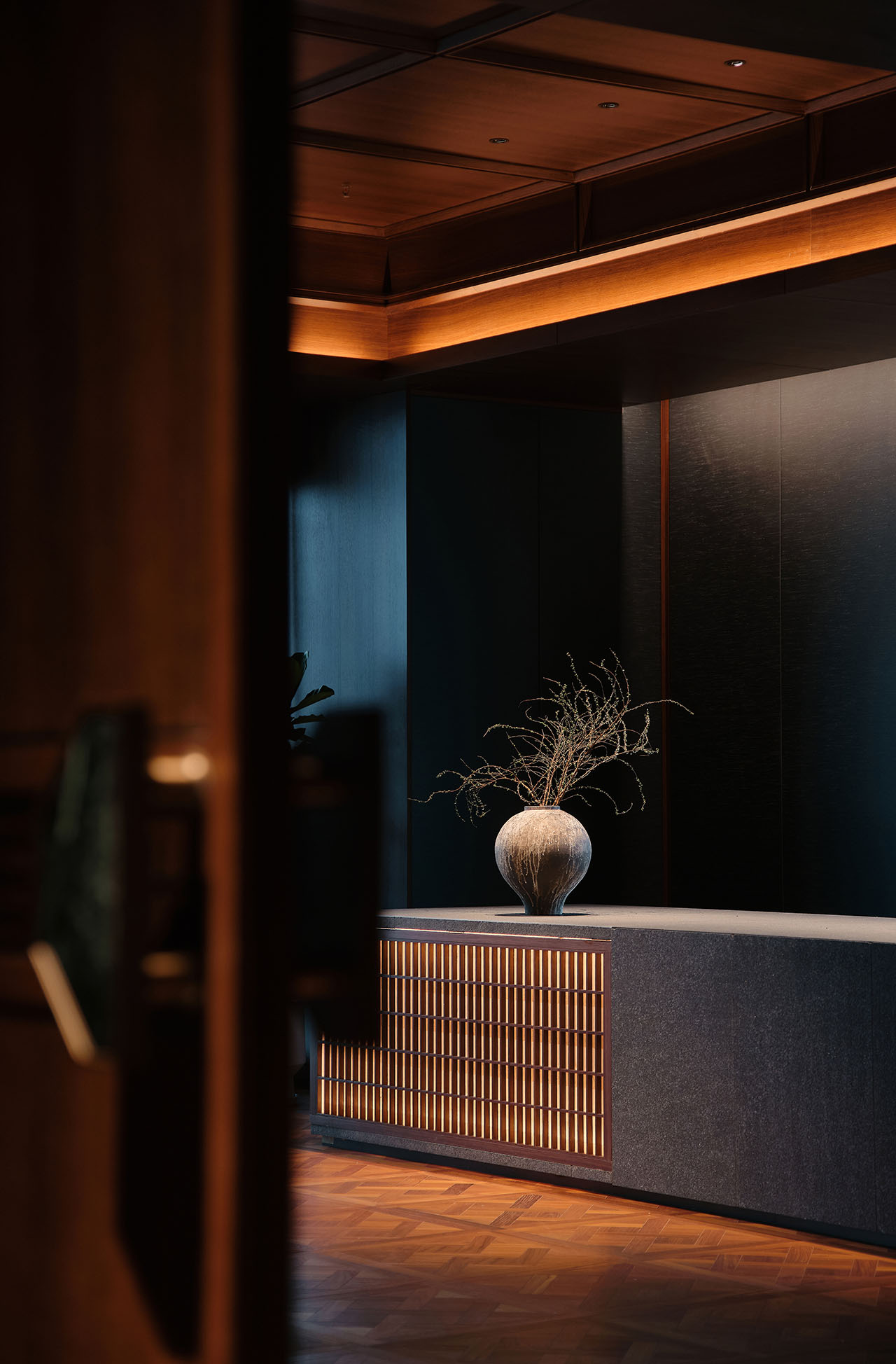 包间四墙面采用艺术漆处理,呈现出触感细腻的纹理。天花板低位光照明营造出幽静的氛围,使整个空间如同被自然光线温柔包裹,带给客人一种心灵的放松与愉悦。整体布局错落有致,既有传统的古韵,又不失现代的简约,让过去与未来,自然与现代,记忆与情感,在此得到融合。