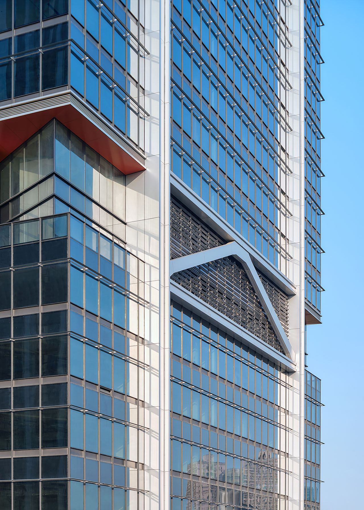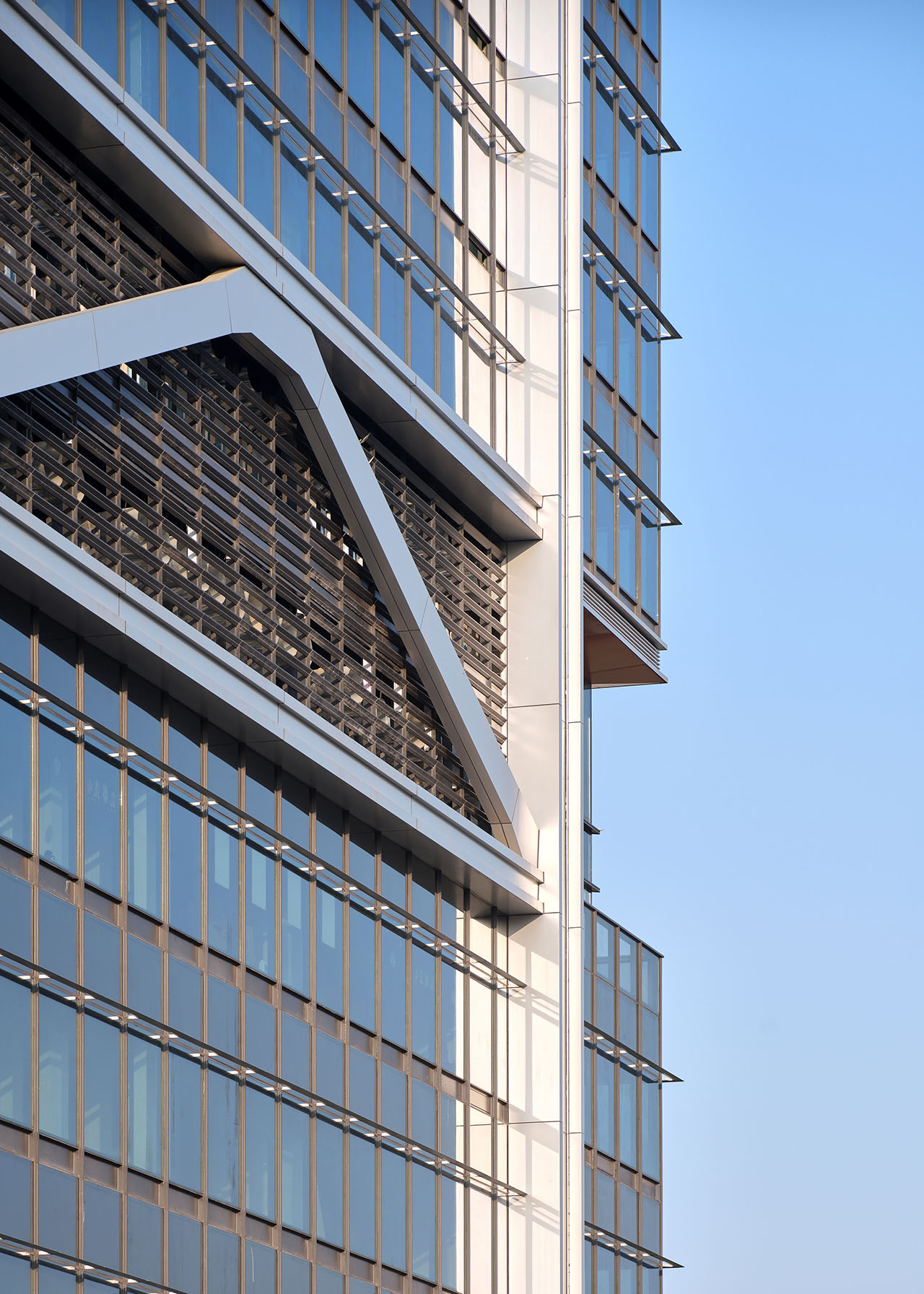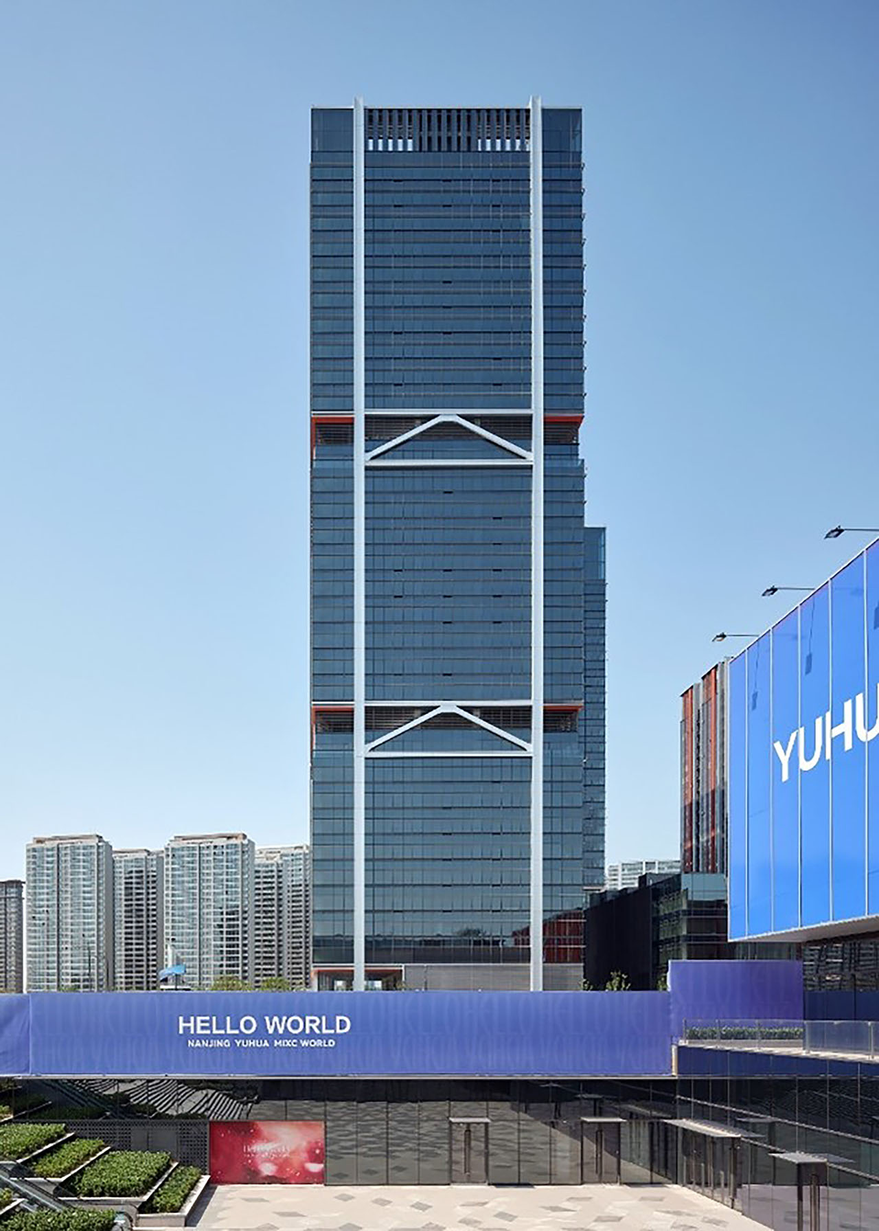 山墙的柱子并非只是装饰,而是结构结合造型,取消传统转角部必需的结构柱,两侧分别留出约9米的玻璃界面,使每层转角形成 270 度无遮挡景观面,几乎消弭建筑表皮的 “边界感”。重新定义了南京高层办公的空间。