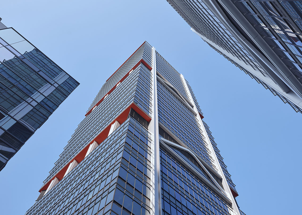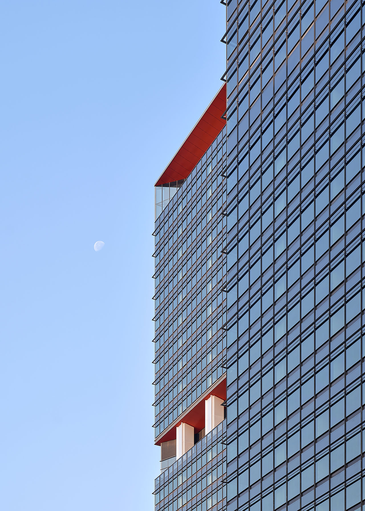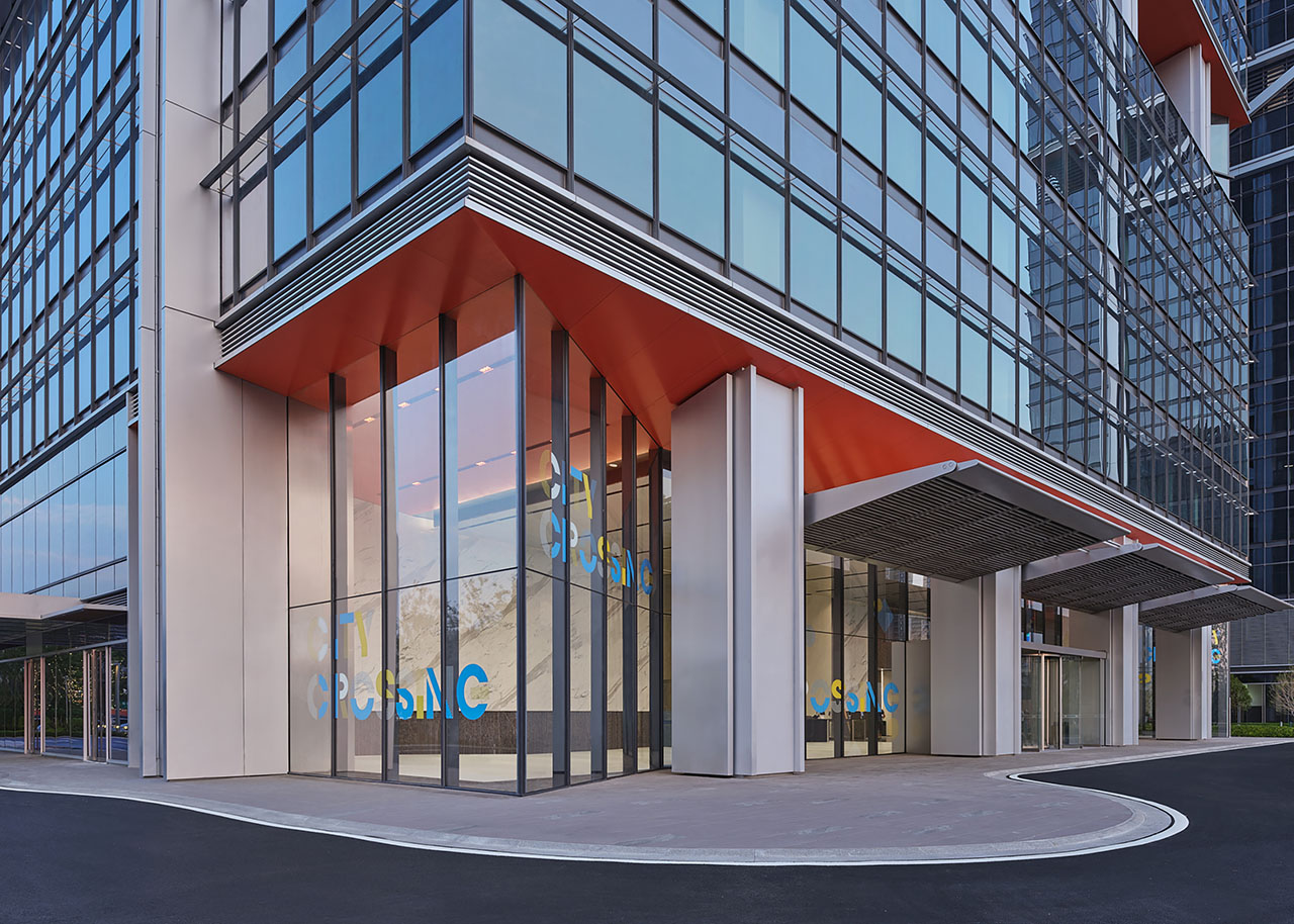 山墙的柱子并非只是装饰,而是结构结合造型,取消传统转角部必需的结构柱,两侧分别留出约9米的玻璃界面,使每层转角形成 270 度无遮挡景观面,几乎消弭建筑表皮的 “边界感”。重新定义了南京高层办公的空间。