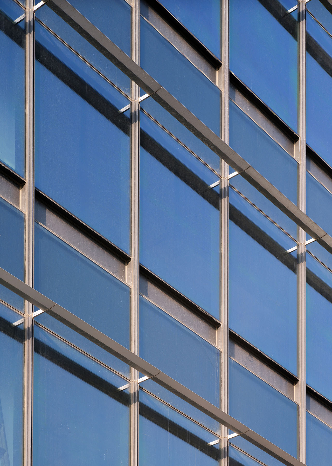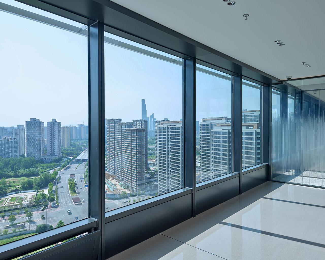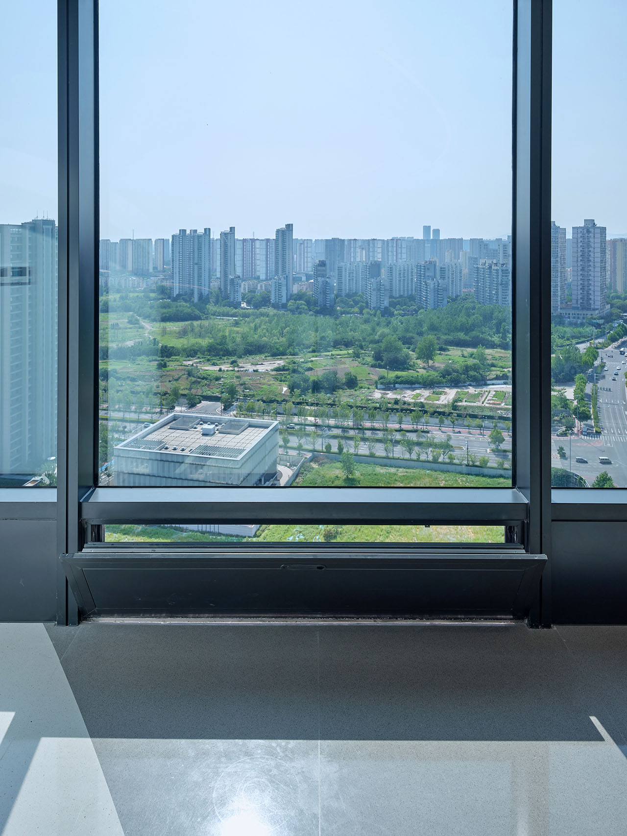 为了最大化办公区域的视野并保证幕墙的完整性,立面采用夹胶中空玻璃,取消防护栏杆。同时把开启扇设在底部,避免了开启对外立面的影响。