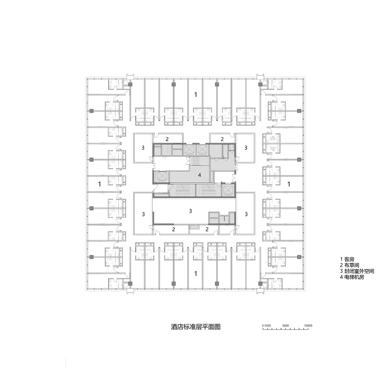 双塔标准层控制在2000平米以内,以方正标准层保障办公效率,因此不做大的内收,仅在大堂、塔冠做局部切角,既呼应200米塔楼的几何语言,又保证了办公空间的方正好用。