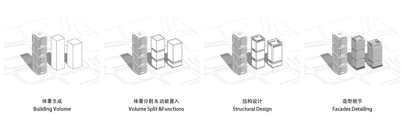 双塔紧邻已经确定方案的200米塔楼,三栋楼需要协调统一,200米塔楼以“视窗”为设计出发点,双塔既要和其协调,又需要有自身的特点,造价也有不同,所以这是一次“限制中的设计”,也是一张有轮廓之后的画作。