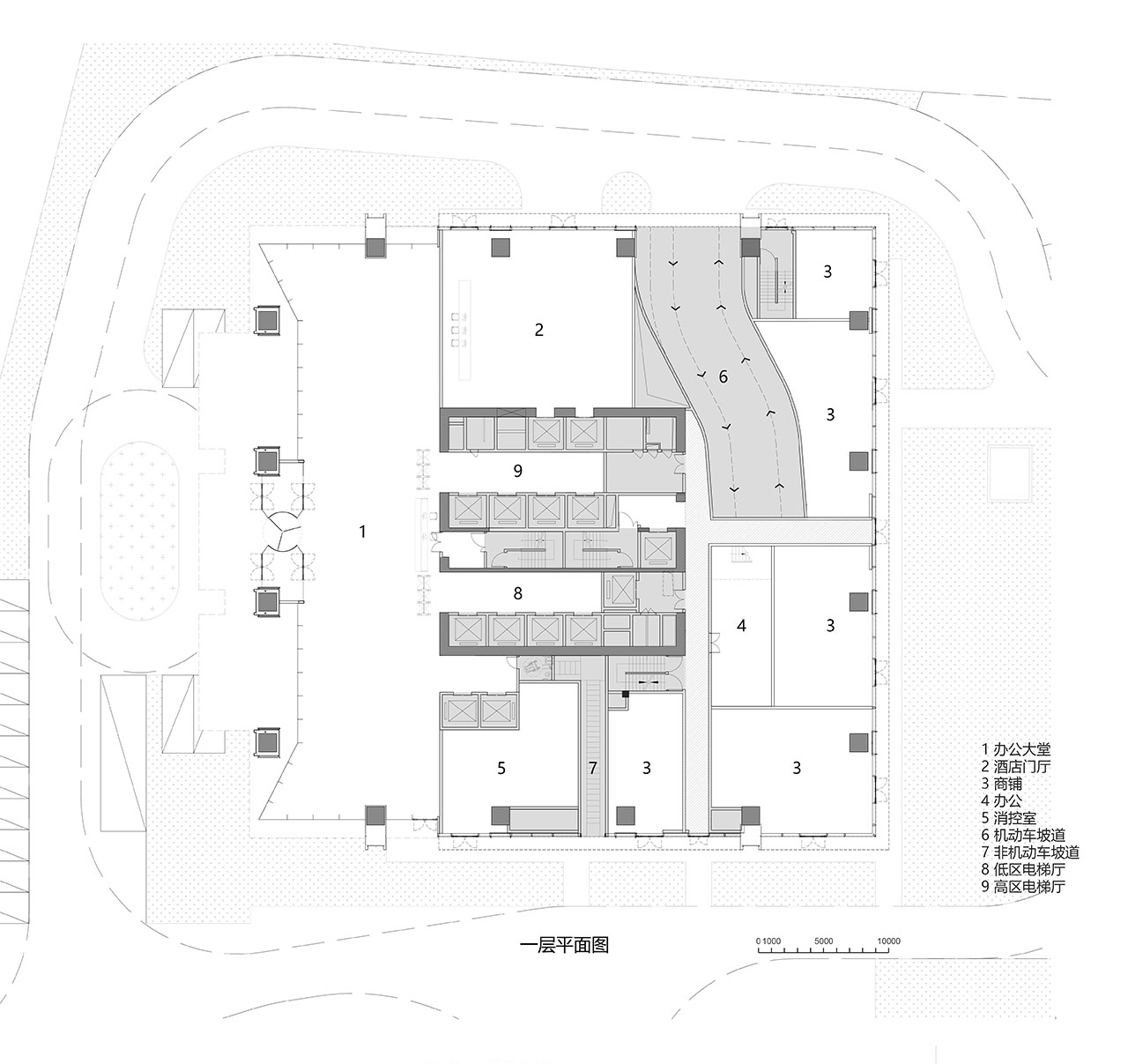 在国内严格的防火分区以及习惯性的中筒结构形式双重限制下,内退往往造成底层空间进深小。本案结合造型,利用角部空间增加其进深感,从而实现了国内少见的无柱大堂空间。通透的大堂让室内外环境沟通,后退的空间也彰显了结构的力量。