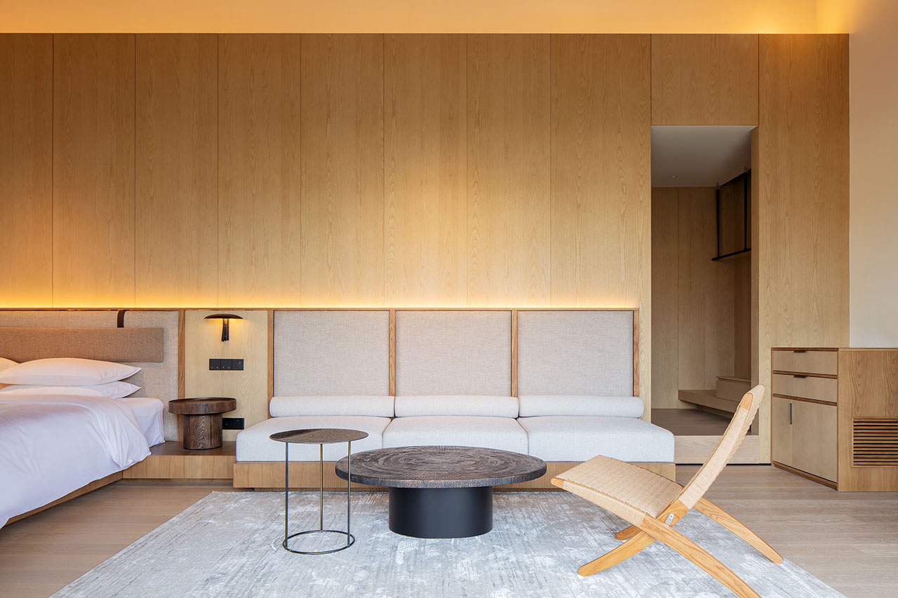 挡雨,为客人提供舒适的居住体验。客房同样也是现代风格,在材料选择上和古典客房基本