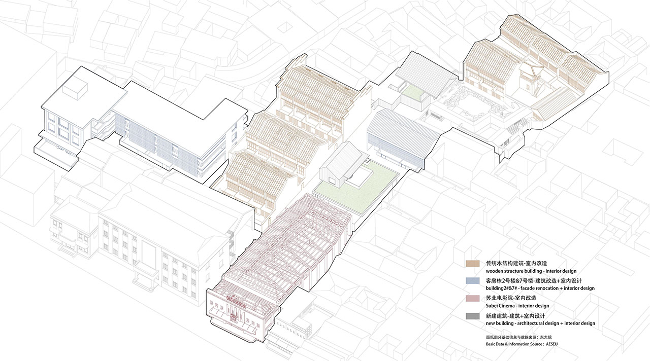 店是地块更新后的主要功能之一。酒店利用苏北电影院放映厅作为大堂,将大堂以北的建筑