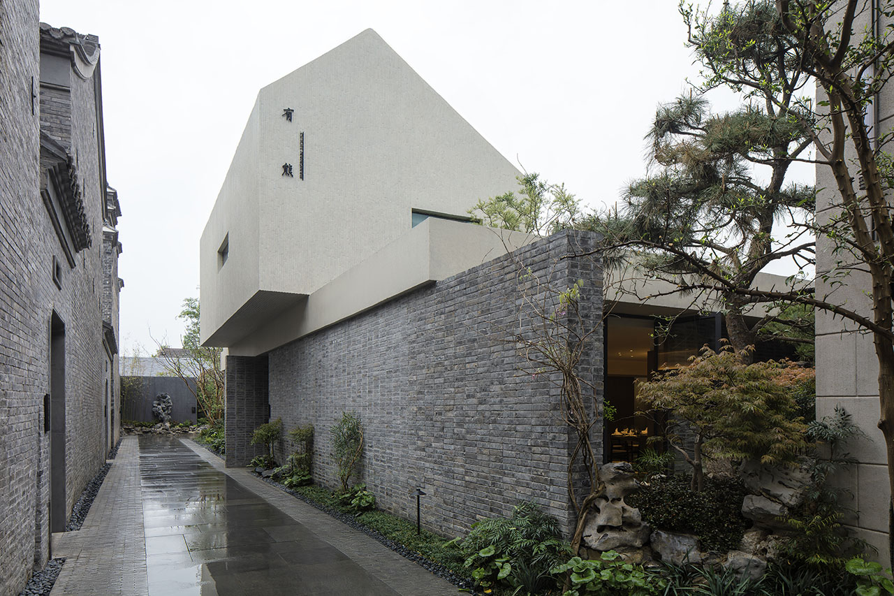 创造了一个开阔的观景平台。客房采用坡屋顶的形式,并借鉴了以竹造景的扬州园林概念,用竹模混凝土打造现代的新式园林意向,一层利用现场回收的老墙砖搭建围墙,用通缝的拼