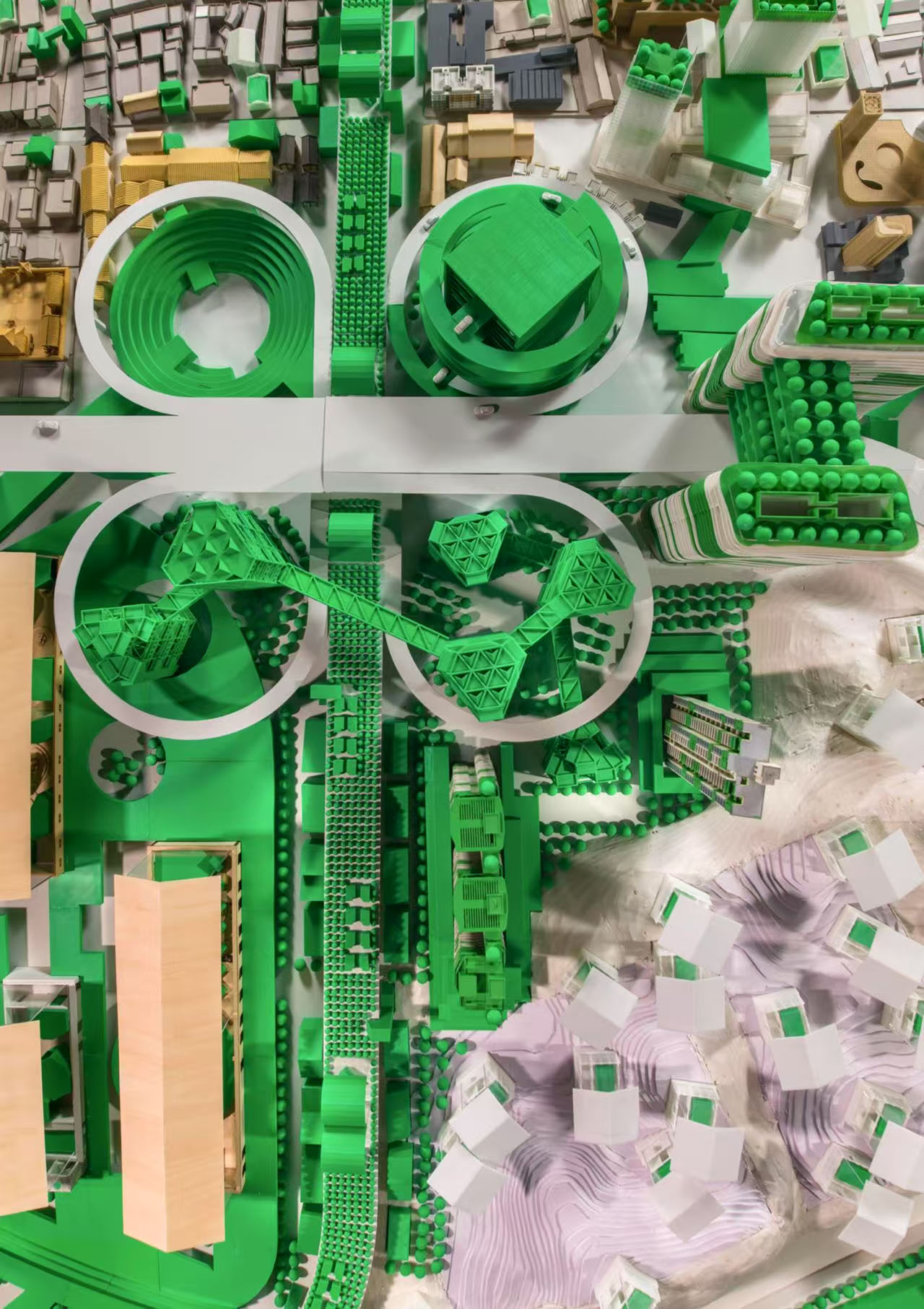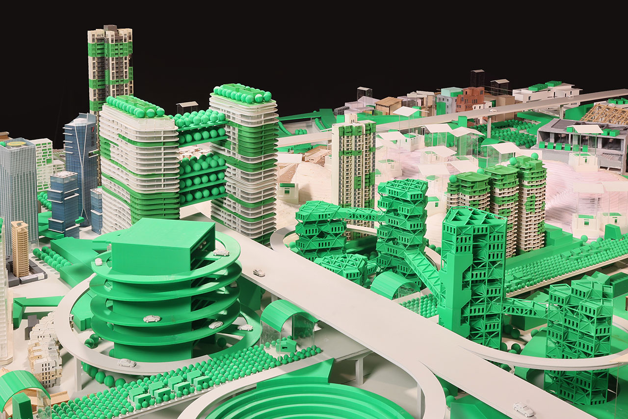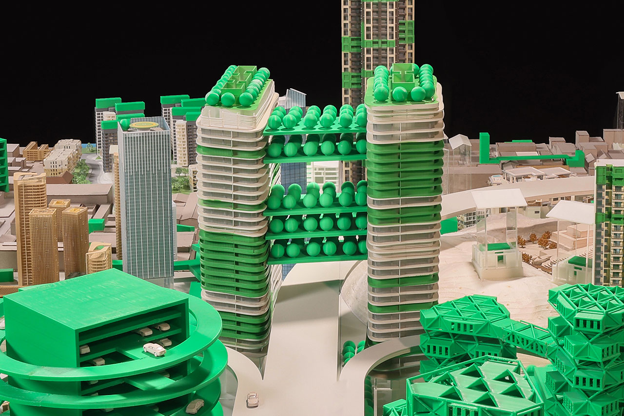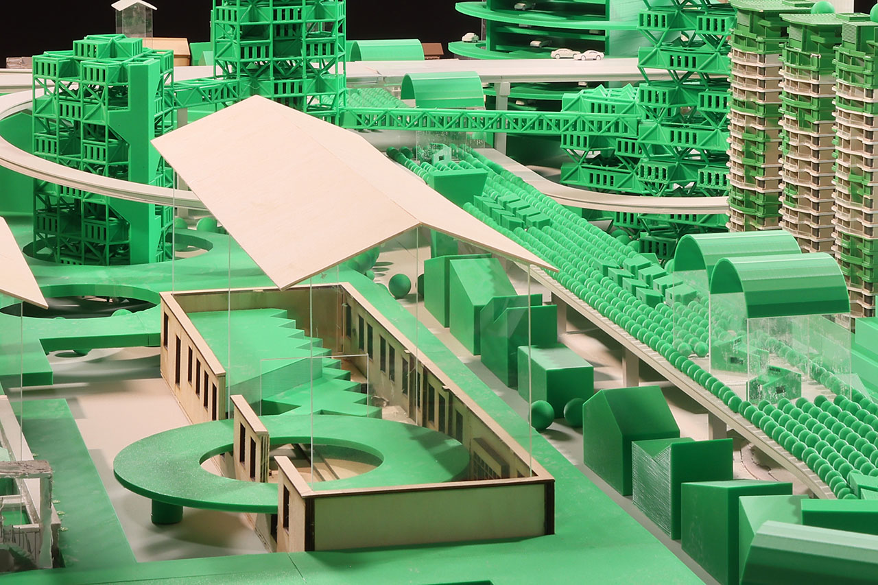 在这片城市图景中,绿色3D打印物件标注展示了"插件"策略的实际应用:在既有建筑内嵌入新结构,在现有空间上下加建新体量,通过连接构件创造新的活动路径与使用方式。