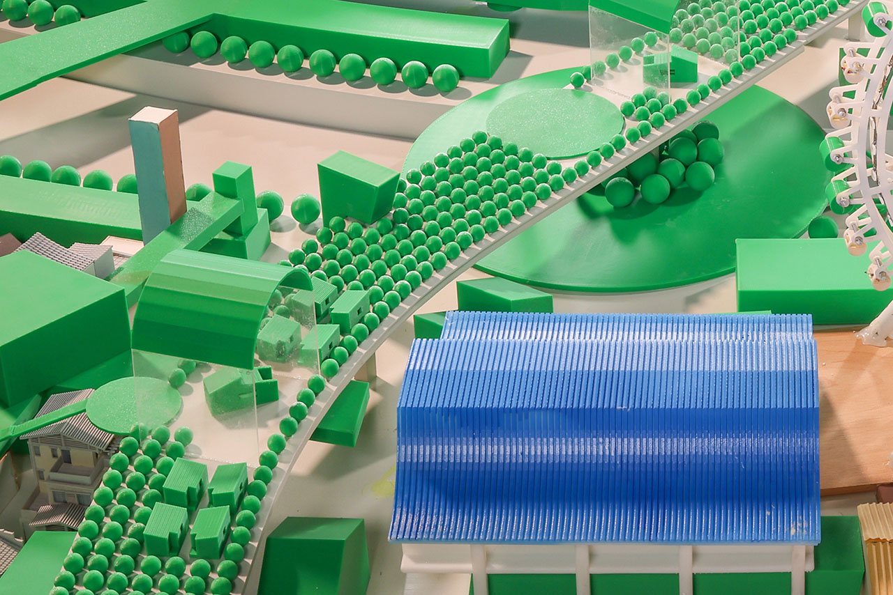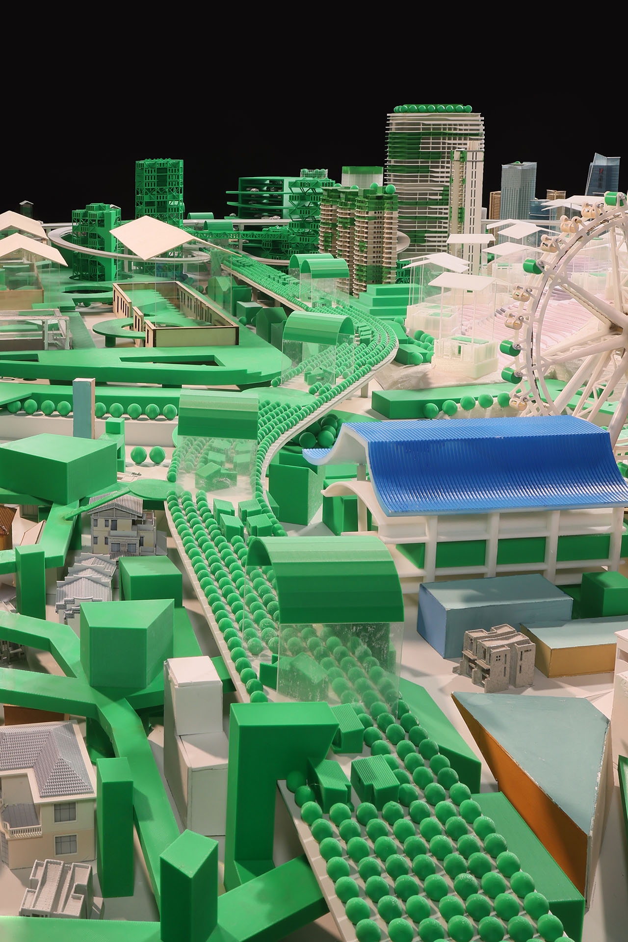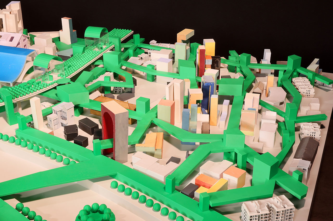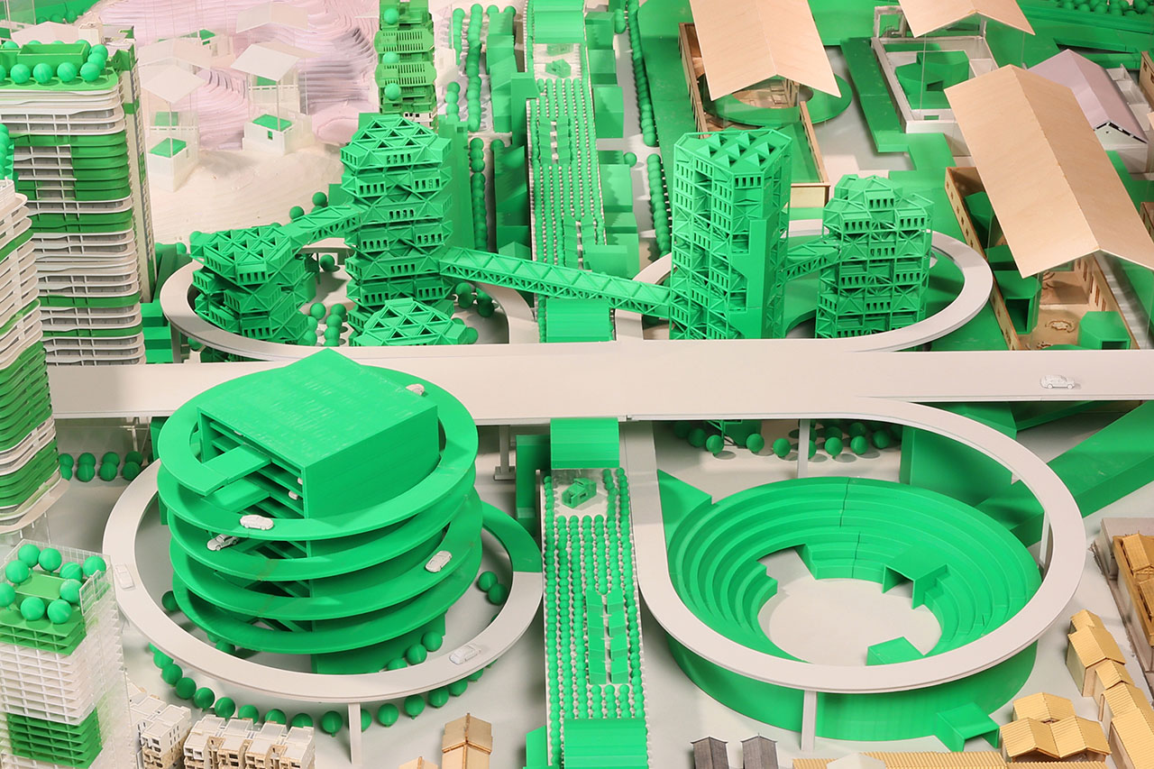 在这片城市图景中,绿色3D打印物件标注展示了"插件"策略的实际应用:在既有建筑内嵌入新结构,在现有空间上下加建新体量,通过连接构件创造新的活动路径与使用方式。