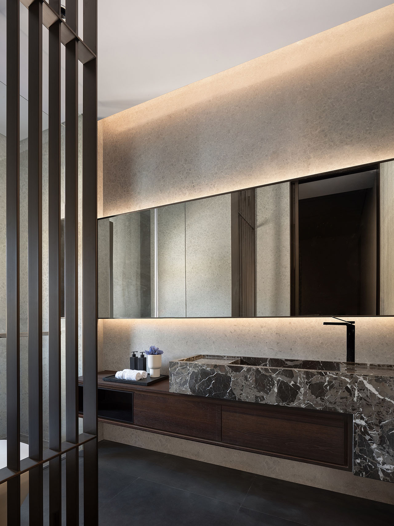 格栅以一气呵成的过渡关联,加强卧室与卫浴空间的连贯性,立体而生动。
