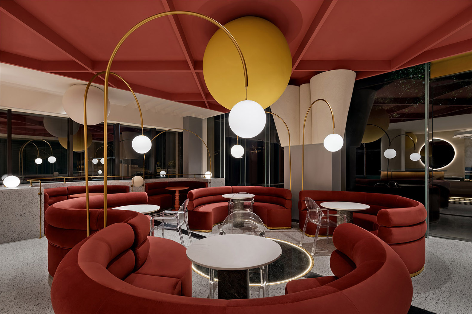 樱桃红用餐区的场域最大,同色系格纹吊顶之下是对称的天鹅绒沙发,魅惑撩人。两侧分别为珊瑚橘及奶油色用餐区,搭配松树绿软垫沙发,气质上更趋向清新、自然。家具设计也趋向设计感,譬如桌子造型灵感来源于意大利品牌VENINI早期大师作品的手稿设计,桌柱试图还原玻璃制品的轻盈、精巧之美。