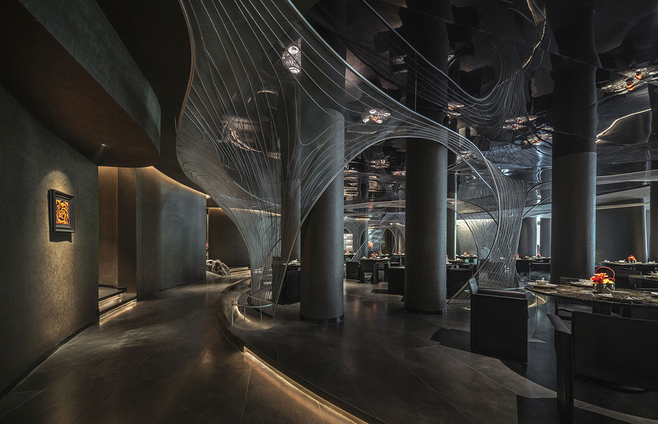设计采用江南园林式的曲径通幽,将功能板块分布在多层次的流动形态环线中,中心区位的水系雾森晕染着当代艺术装置“ 浮云 ”。散座区选择靠近自然采光更佳的窗户和中心环岛的艺术装置中,意外通过场景中的人与空间有更多的交织,映衬繁华景象。