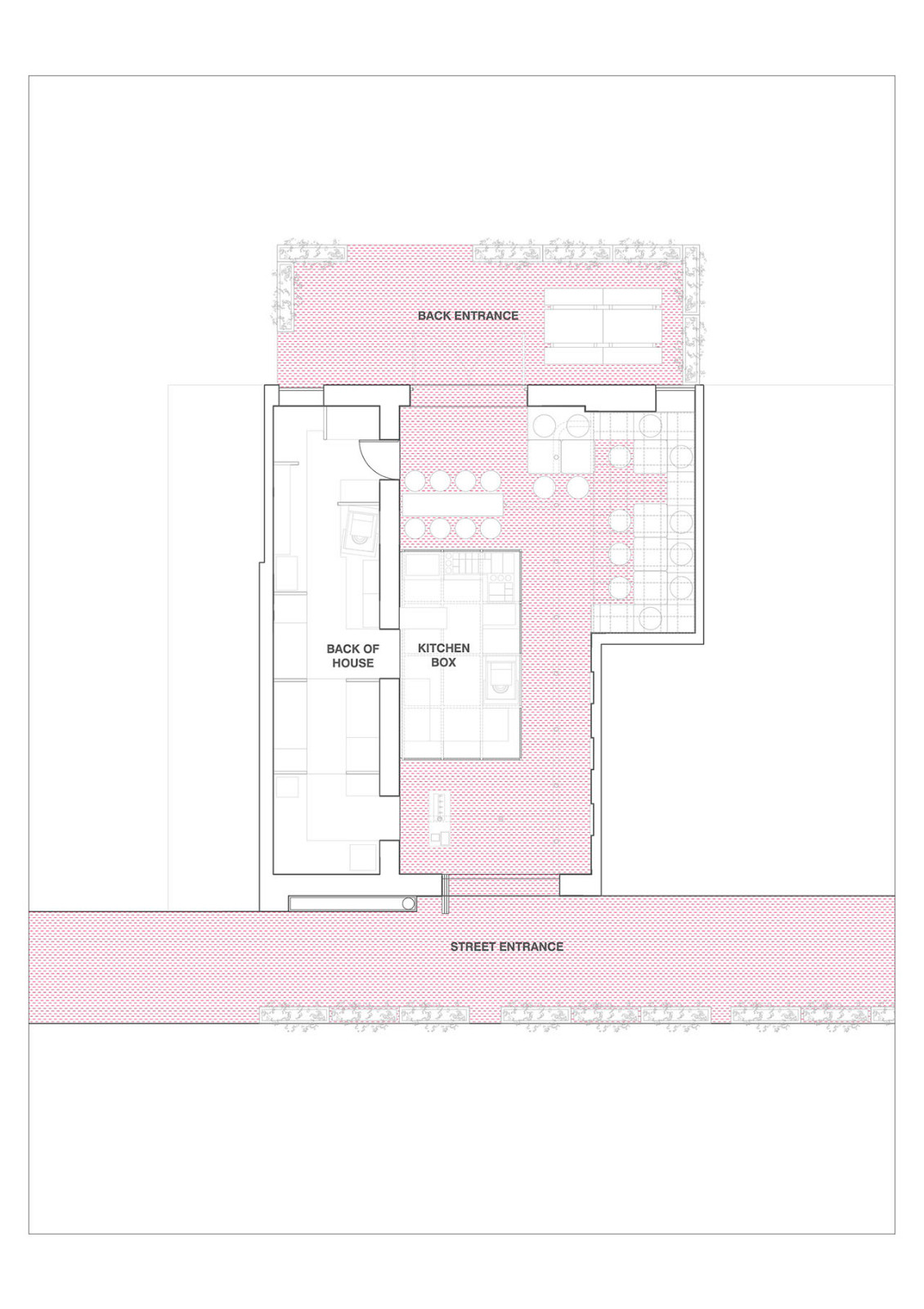 空间中央则是一个独立的厨房盒体,完全包覆镜面不锈钢,呈现干净、克制、流程透明的食物制作核心,让街头食物也拥有精致与秩序感。这种冷静的内核与前后区域的热闹形成可读的叙事张力。空间的最深处则放慢节奏,以更柔和的座椅、降低的照度与一个可转换为 DJ 小台或迷你舞台的灵活区域,提供用餐后短暂停留、社交聚会或轻型活动的可能,使快餐场景被延展为一种更开放的社区体验。