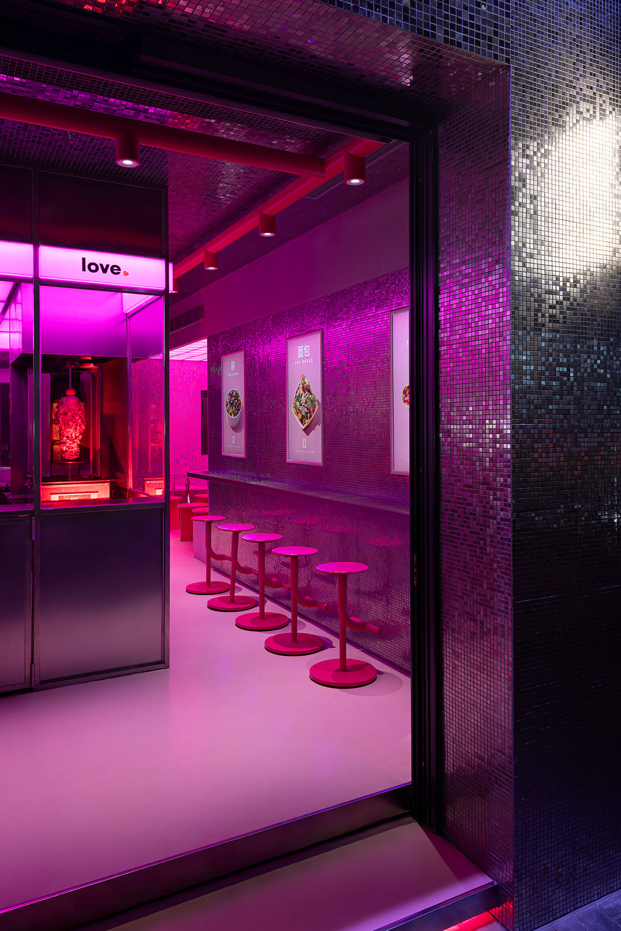 在材料的选择上,空间语言既服务深夜能量,也回应餐饮服务的高强度使用。基础材质以明亮不锈钢与拉丝金属为主,呈现直接、工具化的底色;后区墙面的 ALPI Sottsass 粉色饰面向 Memphis 精神致意,既柔和又锋芒,与品牌标识呼应,并与霓虹光、饱和膜材等元素共同强化“Disco”气场。耐磨的粉色地面经得起夜间高频使用,而后场的织物与吸音处理提升亲密度,使空间的节奏从硬朗到柔和自然过渡。视觉图形与装置延伸街头、音乐与涂鸦线索,将 Döner 融入更大的亚文化语境中。