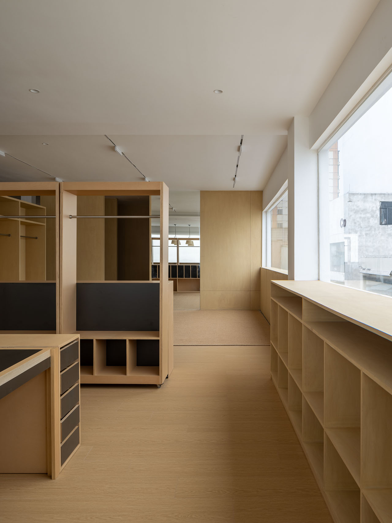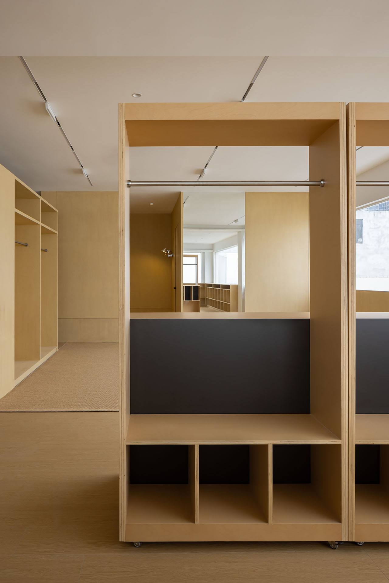 剥离掉面层装饰,保留最基本的空间单元。功能在水平轴线上以敞开的方式分布,利用家具自身的体量与尺度进行空间分割,在统一的材质下,模块化与可移动设计给空间带来一定的可变量,也给后续的局部调整预留可行性,敞开的方式使整个办公效率得以最大化。