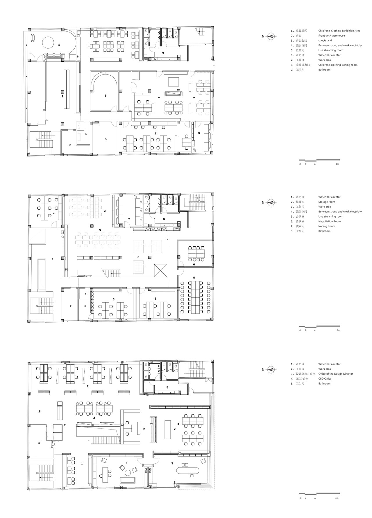 在剖析了整个办公业态属性后,设计的介入由纵向轴线先行展开,功能区沿三个楼面分层布置,1F为综合办公区;2F为产品打样制作区;3F为综合设计区;根据多层空间这一属性,垂直交通体系成为连接三个楼面的唯一路径。
