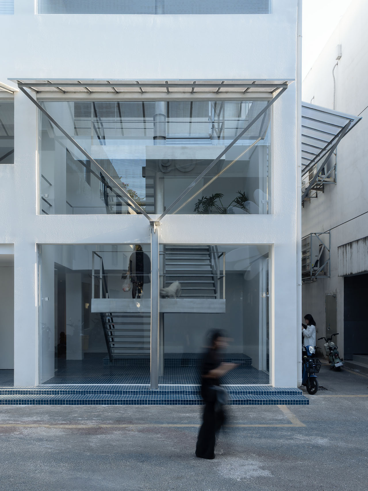将楼梯从整体功能机制中解构,成为一个独立的单元,采用单立柱悬挑结构,以敞开的方式给予街道积极的回应,与街面形成相互渗透的状态,从而使楼梯成为这一街区的符号。