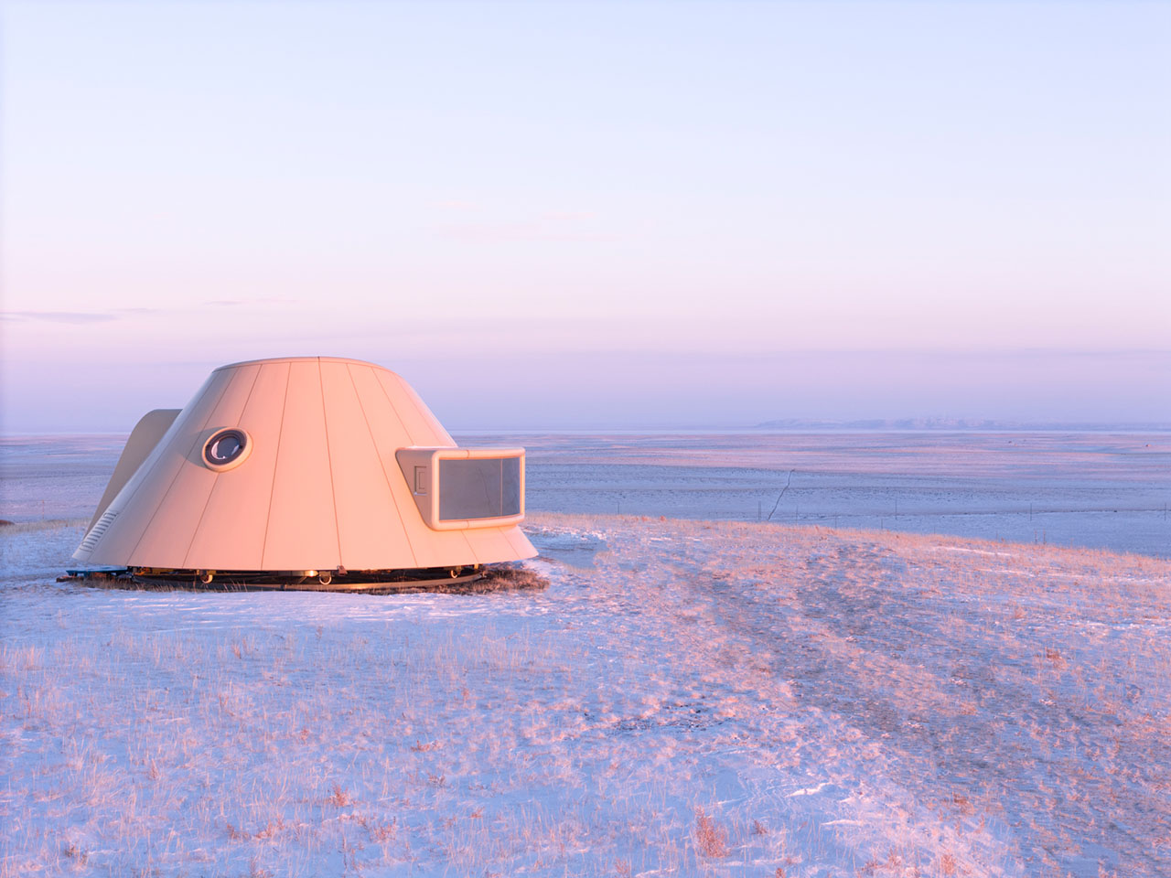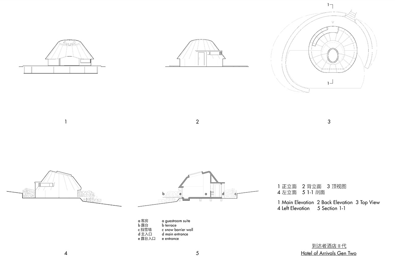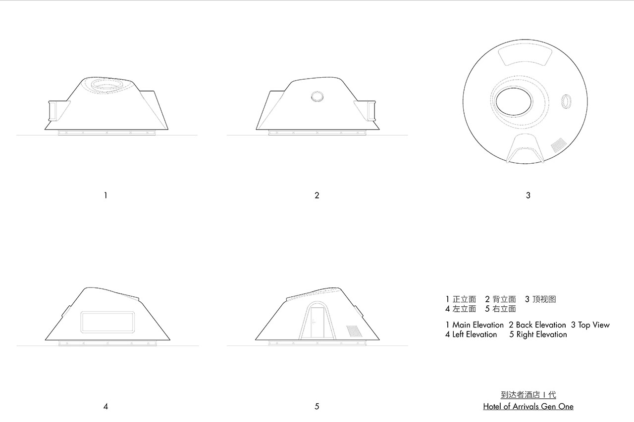 酒店单体的设计经历了从帐篷原型到到达者号的两次演变,到达者号同样经历两次迭代,其一代是旋转建筑,20245月,首个到达者号(一代)运送至现场拼接吊装完成,坐落在到达者酒店(二代)群落北边的山丘,东侧是天火台,西北是游客中心。建筑采用点状基础支撑旋转电机,旋转装置让单体漂浮在火山之上,提供了建筑追随日光、可环视360度的草原火山景观。二代到达者号的迭代保留了一代的火山型,同时扩大室内空间,增加室外露台和独立庭院,以满足度假环境中人对空间尺度和功能的需求。从酒店群落区回望矗立在山顶的第一个到达者号,它的拓荒与先行虽然孤独,但也率先享受胜景的礼赠。