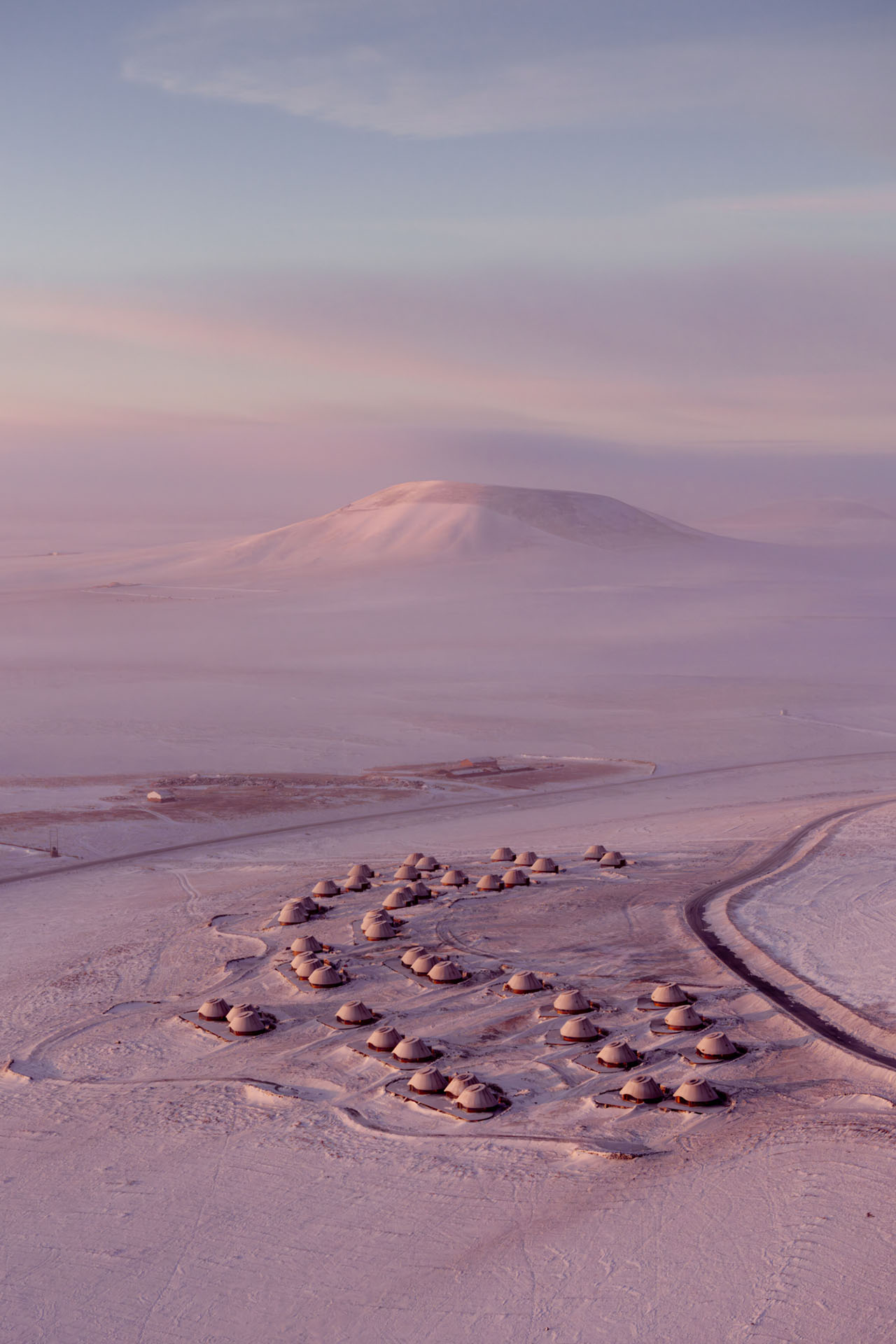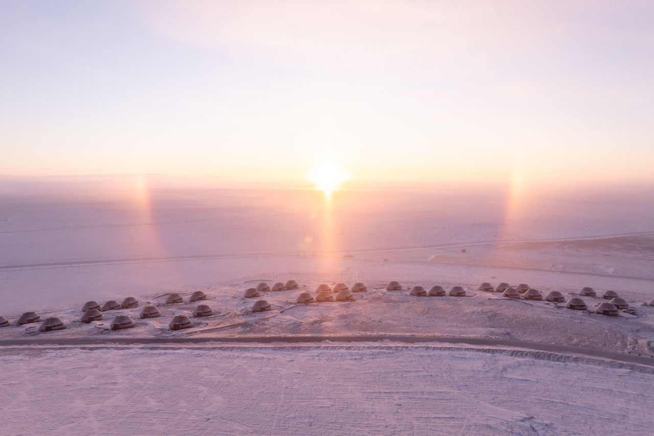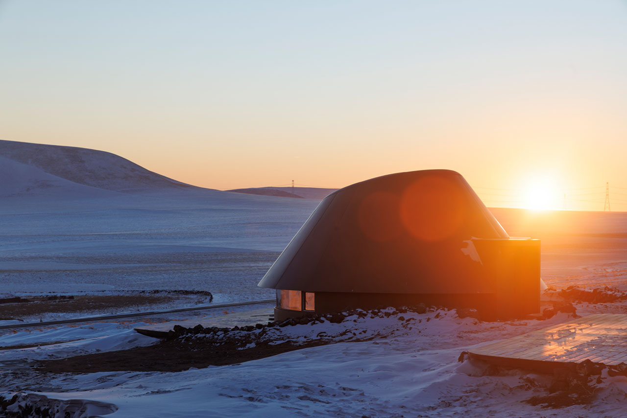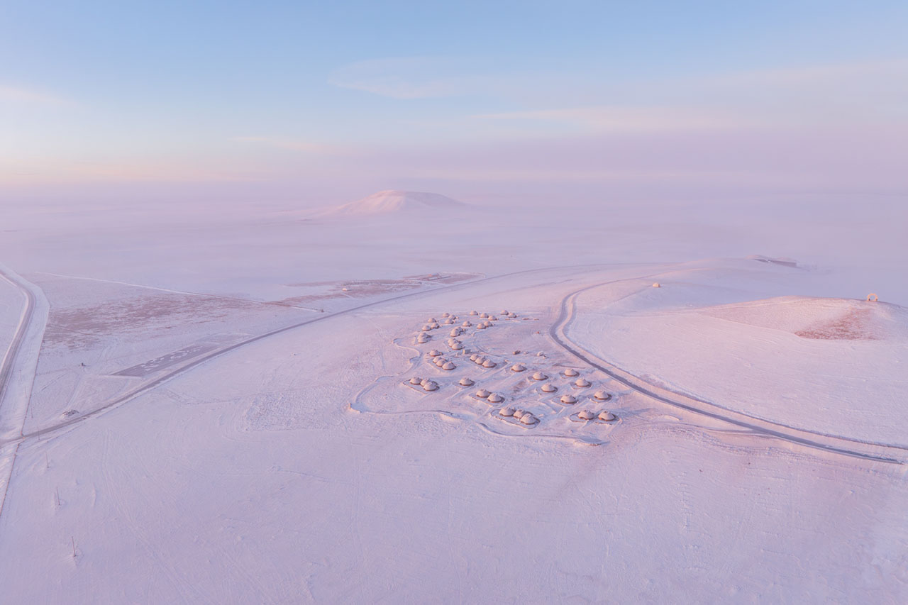 设计团队及业主在2022年为酒店选址考察时,即在这座火山南侧发现了一片只生长蒿与苋菜的地块,相比周围上百座火山丰富的物种群落,这里的植被过于单一,究其原因,这座呈C型溢流口的火山遗迹经过约15万年的风蚀雪侵,其锥体逐渐剥落成九个被草原覆盖的柔缓山丘。酒店地块处于该火山的东南侧,是西北风的下风口,这里的洼地坡面背风积雪,吹来的沙土逐渐聚积停留,故此难以负荷植物生长。因此酒店特别选址在这处深约2m的沙土存积处,既避免影响其他区域,也意在通过酒店来改善并最终消除这片沙土,最终恢复地块的生命力。具体解决策略包括利用每间单体的弧形挡雪墙在冬季留存积雪、丰沛水土,为春季的植被生长创造养分环境,以改变这片曾受风蚀而扩大的沙土区域。
