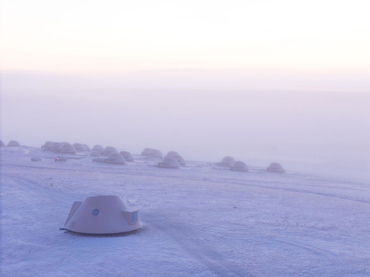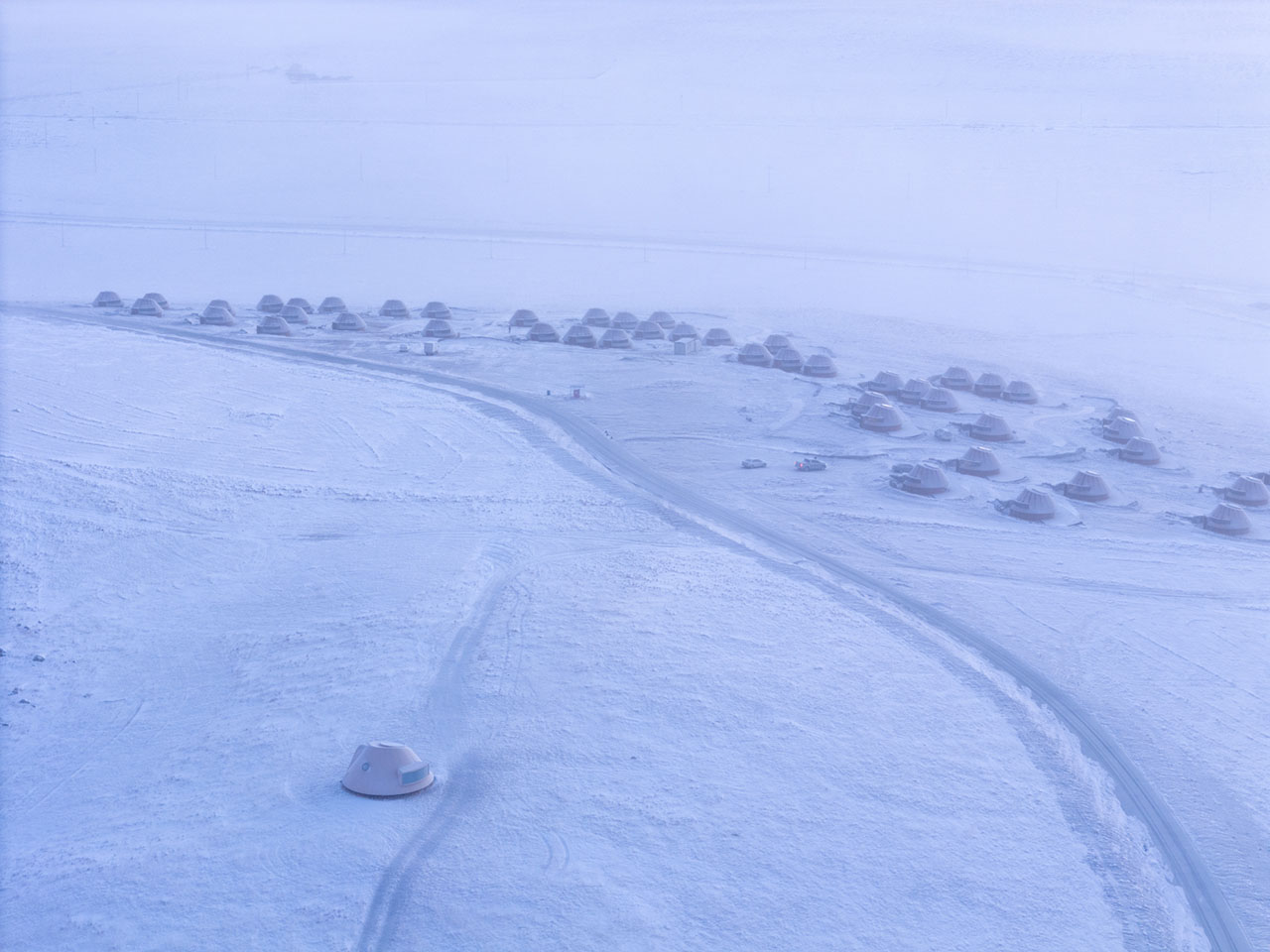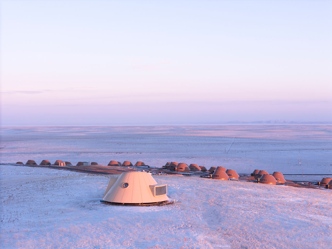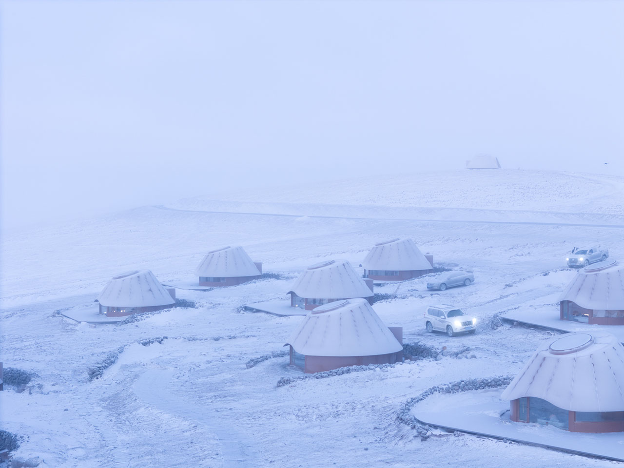 设计团队及业主在2022年为酒店选址考察时,即在这座火山南侧发现了一片只生长蒿与苋菜的地块,相比周围上百座火山丰富的物种群落,这里的植被过于单一,究其原因,这座呈C型溢流口的火山遗迹经过约15万年的风蚀雪侵,其锥体逐渐剥落成九个被草原覆盖的柔缓山丘。酒店地块处于该火山的东南侧,是西北风的下风口,这里的洼地坡面背风积雪,吹来的沙土逐渐聚积停留,故此难以负荷植物生长。因此酒店特别选址在这处深约2m的沙土存积处,既避免影响其他区域,也意在通过酒店来改善并最终消除这片沙土,最终恢复地块的生命力。具体解决策略包括利用每间单体的弧形挡雪墙在冬季留存积雪、丰沛水土,为春季的植被生长创造养分环境,以改变这片曾受风蚀而扩大的沙土区域。