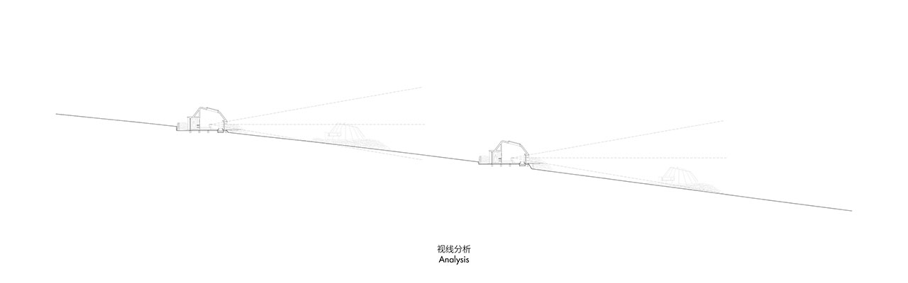 横卷长窗的图景源自卷轴在画案的横展,设计分析了手卷《千里江山图》(高51.5cm),《游春图》(高43cm)的画幅,据此选择45cm作为横卷长窗的高度及3m的长度收入风景,酒店的弧形挡雪墙也随着深入“画卷”长窗。立轴景窗的尺寸则取自郭熙《早春图》(高158cm)等经典立轴的尺寸,选择150cm的高度,构成室内观赏自然山水的图景。锥型建筑屋面轮廓和窗景为人定义了在室内坐卧,贴近大地的适然场景,和敬畏、怀想,被治愈的自然画境。