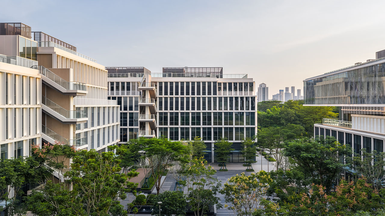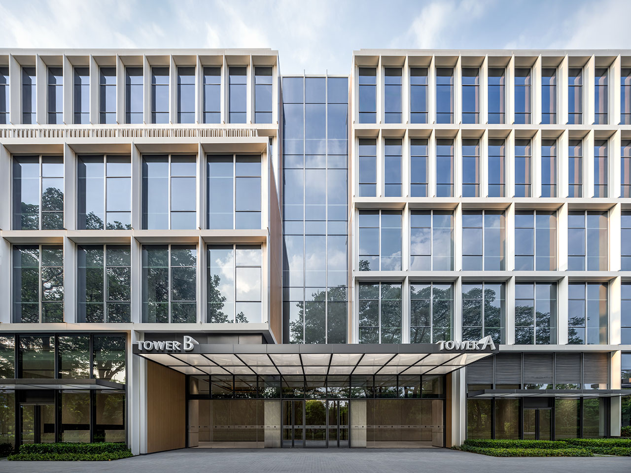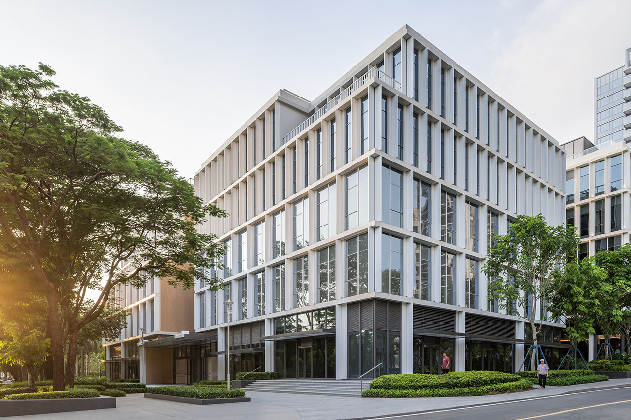 整体建筑有大量自然光通过竖向天井与透明的流线空间深入室内,营造出明亮、健康、宜人的工作环境。白色铝制立面与细长竖向遮阳肋片共同过滤阳光,确保用户在亚热带气候下使用的舒适性。这些建筑共同展示了深思熟虑的建筑设计如何在回应业主诉求的同时,创造出灵活、高效、以人为本的新一代办公场所。