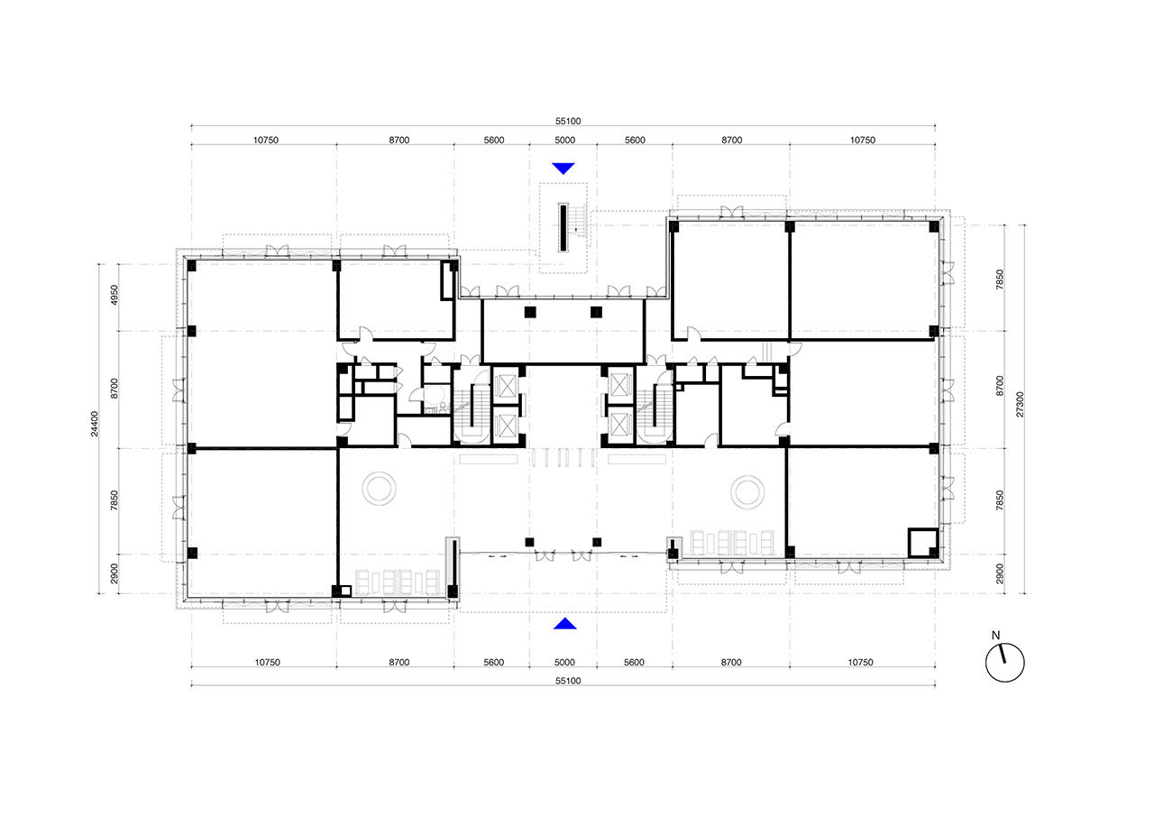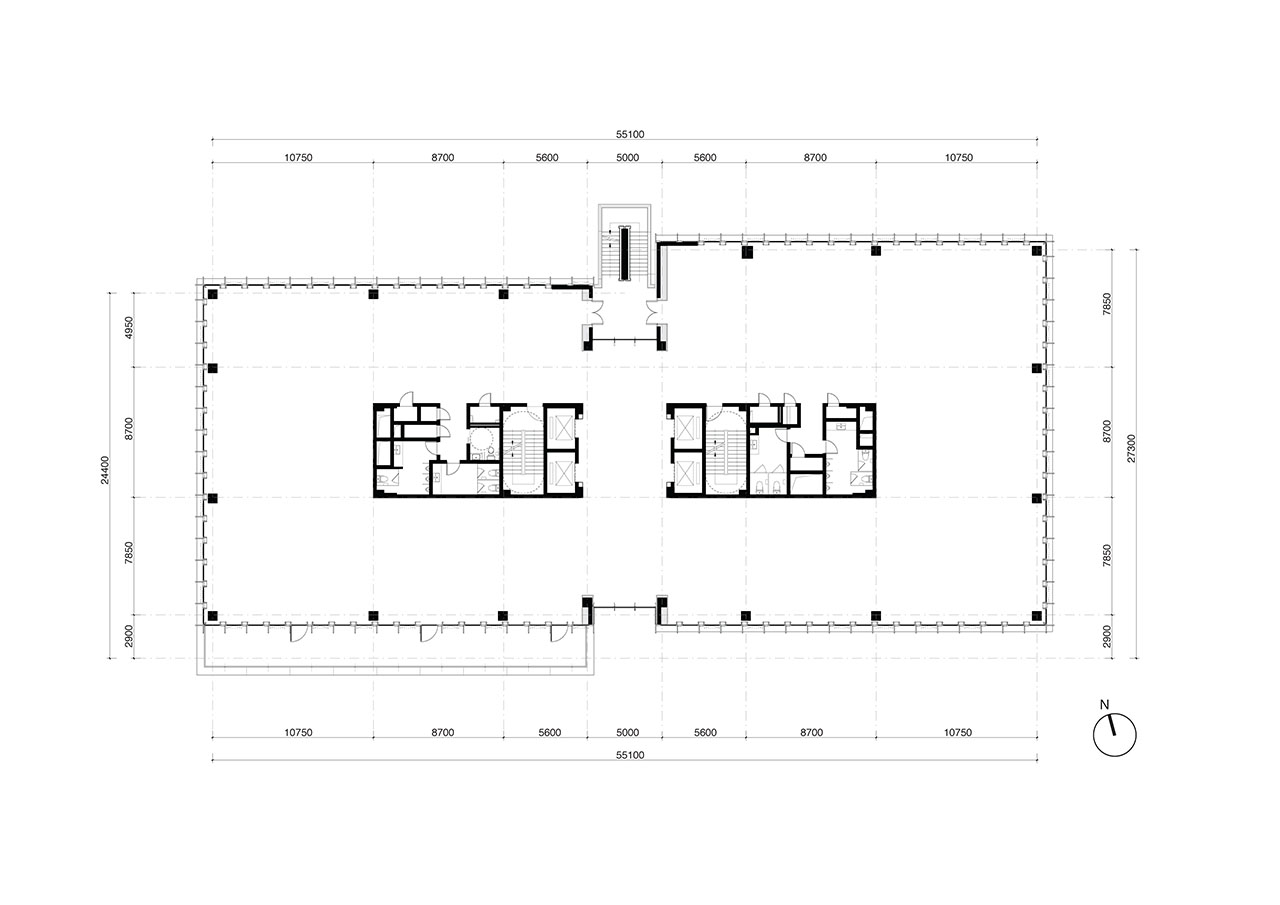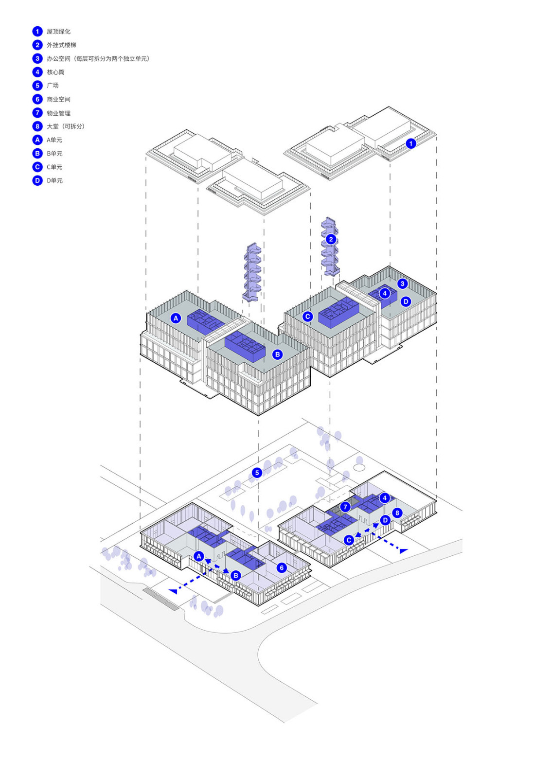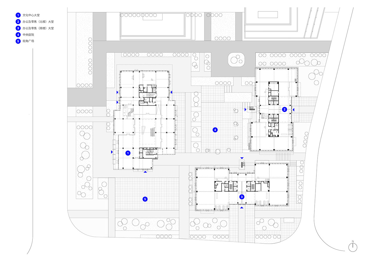 在项目的南侧与东侧,两栋办公楼延续了体量错动与层叠露台的建筑语言。Superimpose叠术建筑从设计开始就与业主紧密合作,将建筑表达与灵活、可持续的租赁策略相结合,使最终的建筑更好的适应其灵活商业策略,每栋垂直分区以容纳两组独立租户,配有专属入口与大堂。这一策略不仅将项目商业潜力最大化,也将客户需求与未来工作模式演变的理解清晰体现。