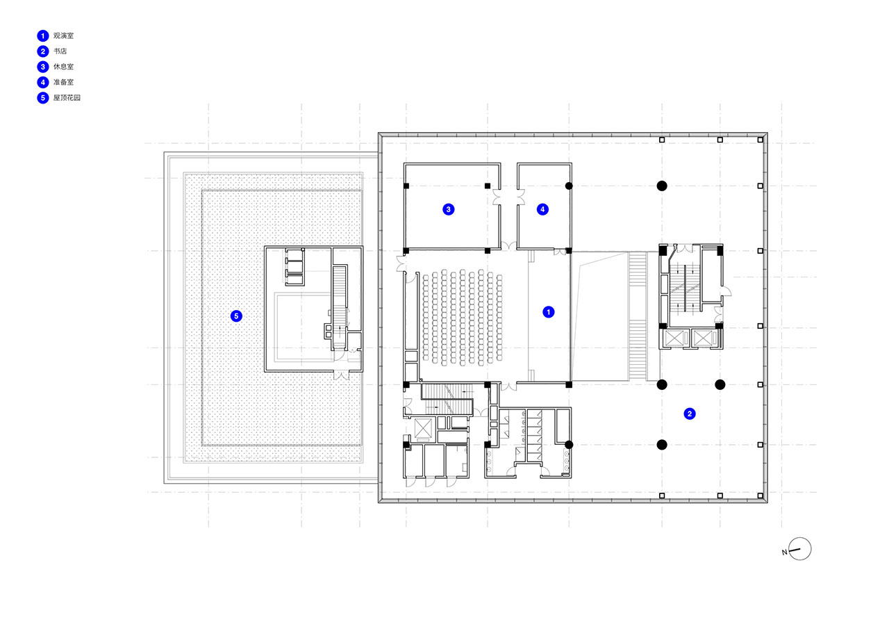 建筑立面进一步将多样性统一整合:竖向框架、富有层次的横向楼板以及半透明玻璃相互呼应,在开放性与私密性中达到平衡。通透的首层邀请公众进入,中间的建筑体量被磨砂玻璃包裹,承载社区空间;而顶部的体量以丝网印刷玻璃为主,内部为剧院与公共大堂。露台与天花处的温润木质饰面为建筑增添了温度。