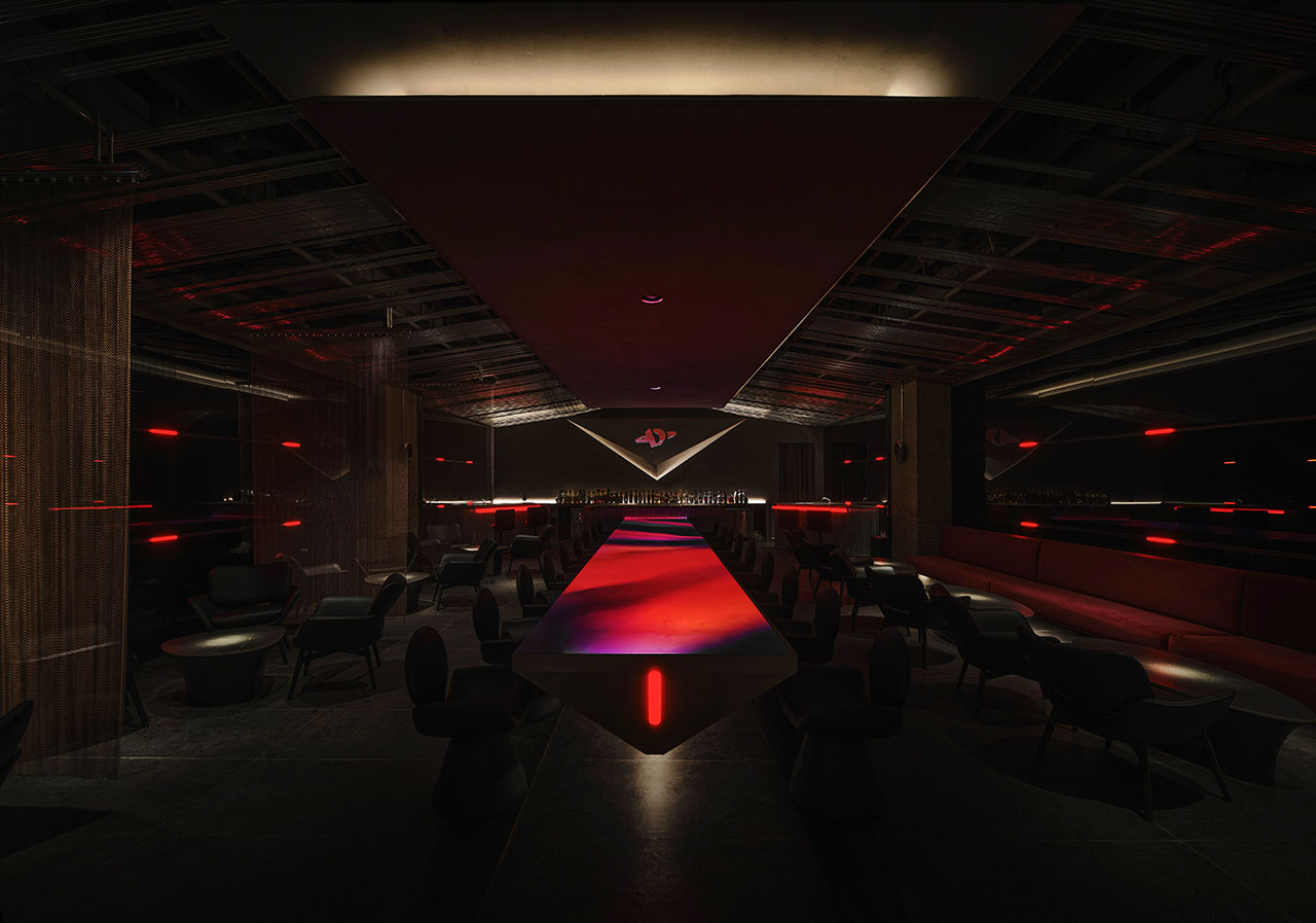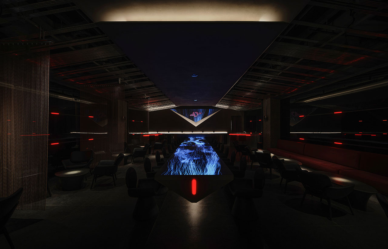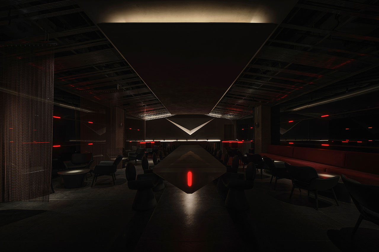 贯穿天花的三角几何体块则成为空间的视觉锚点。削薄的边缘与光带交织,如同切开空间的能量裂缝。静态时通过灯光洗照呈现出强烈的立体感,使空间在现实与幻象之间自由切换。