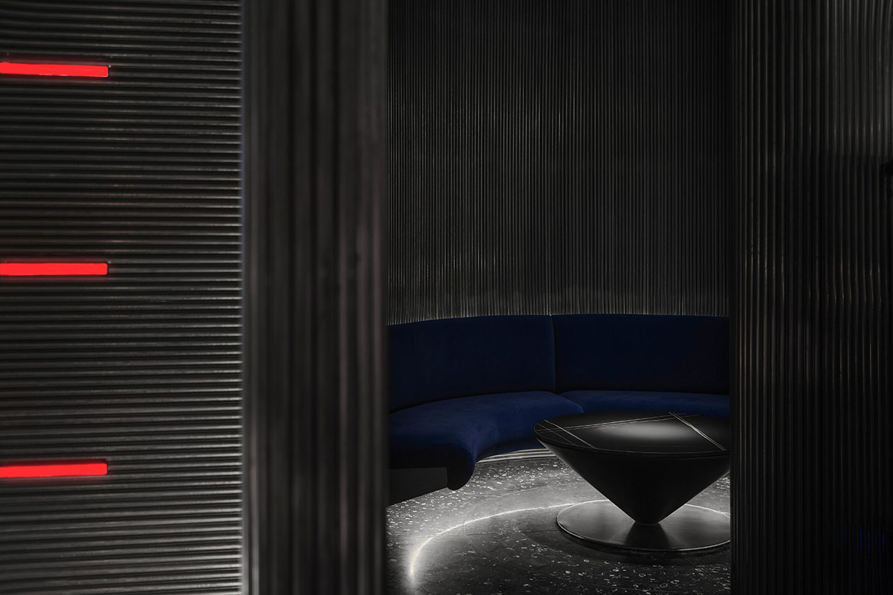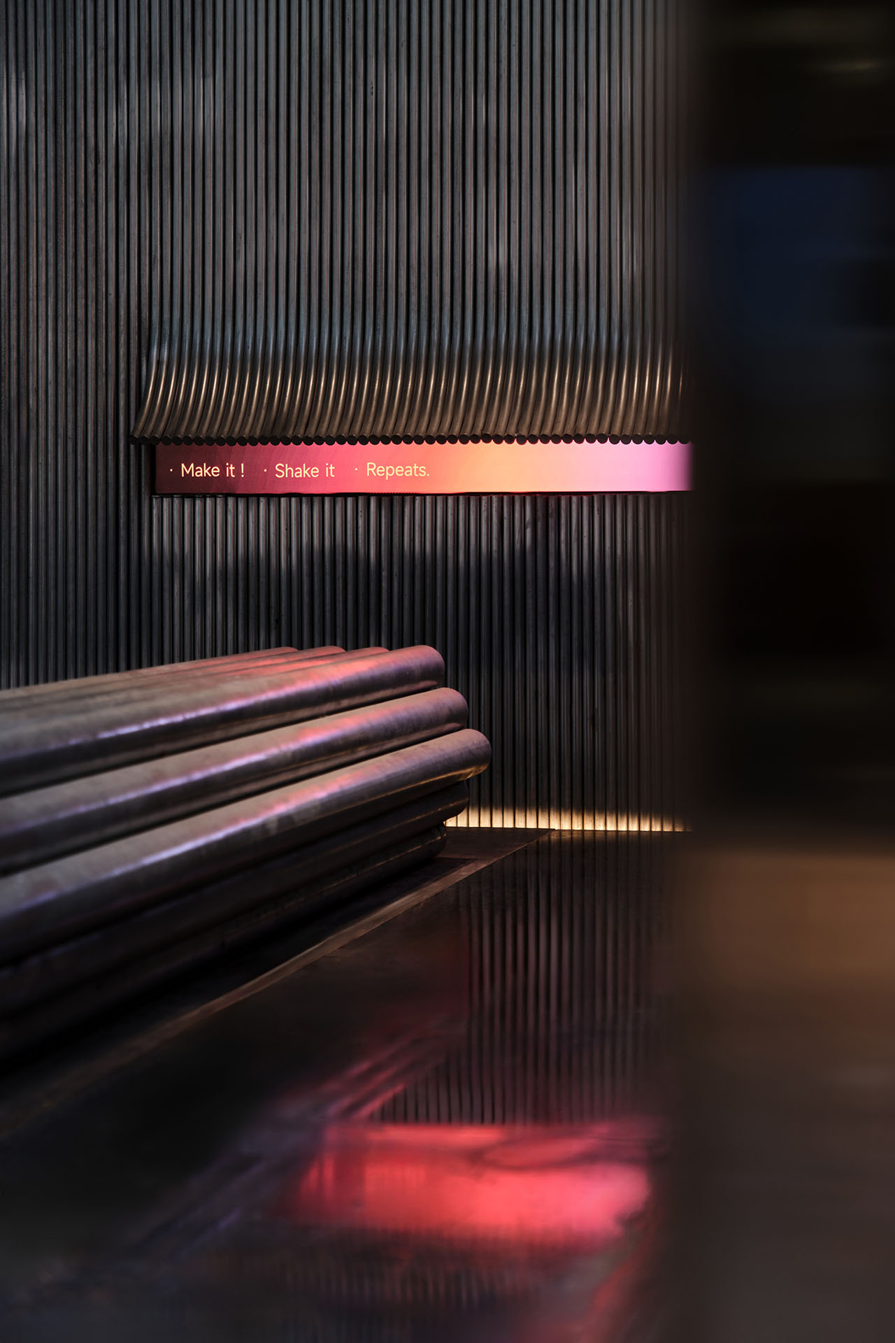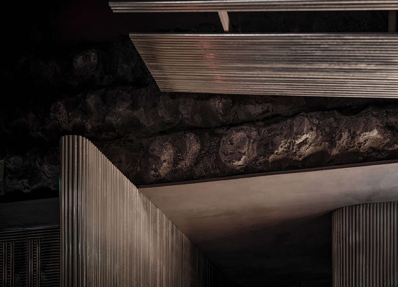 黑色岩石从室外延伸至室内,镀锌管材贯穿天花,线性秩序覆盖裸露结构,反射光影暧昧而游离。原始材质与数字影像的叠加,构筑出粗粝又未来感的张力。