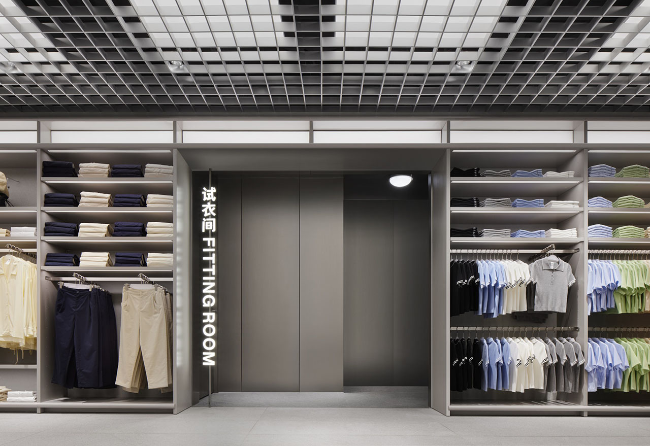 以戏剧化的方式进行设计,利用不同建筑元素如立柱、盒子、独立展台和架子的层次与节奏,定义出人工的森林网格。冷调材质和温暖色彩之间的对比则加强了空间的触感和深度,创造出有趣的活动和丰富的体验模式。功能性的墙架陈列着众多货品,依次排列于森林的周围,天然石材地板和铝制天花板将整个空间串联起来,品牌的形象气息弥漫扩散于森林之中。