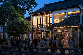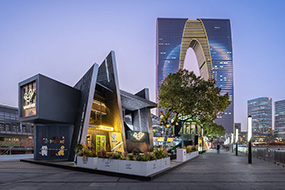 瓷砖外立面上方,闪烁着红色霓虹的品牌Logo置入场景之中,与街区内其他灯牌形成视觉对冲,吸引着街道上熙攘人流的目光。