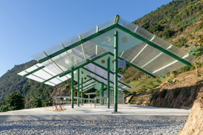 建筑平行于大地水平向舒展开来,主体钢结构骨架外露做深灰漆,各功能空间立面外裹透明聚碳酸酯板。似一位匍匐在桨板上的冲浪者,赤膊抓浪,肌肤黝黑。